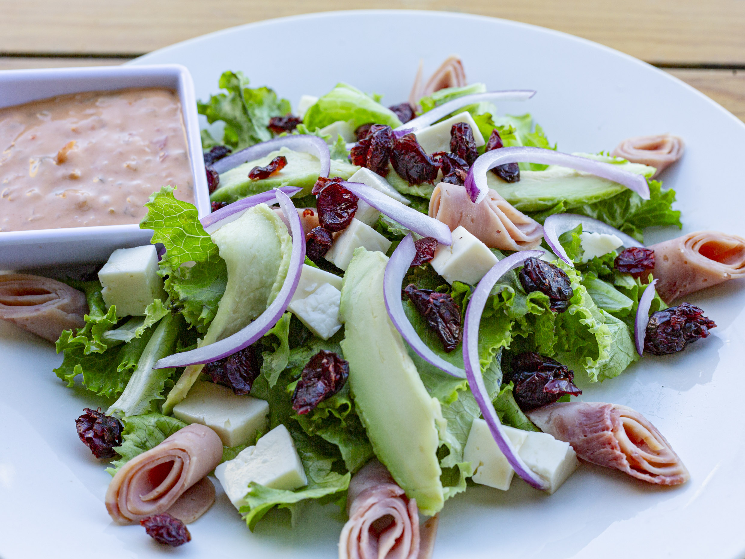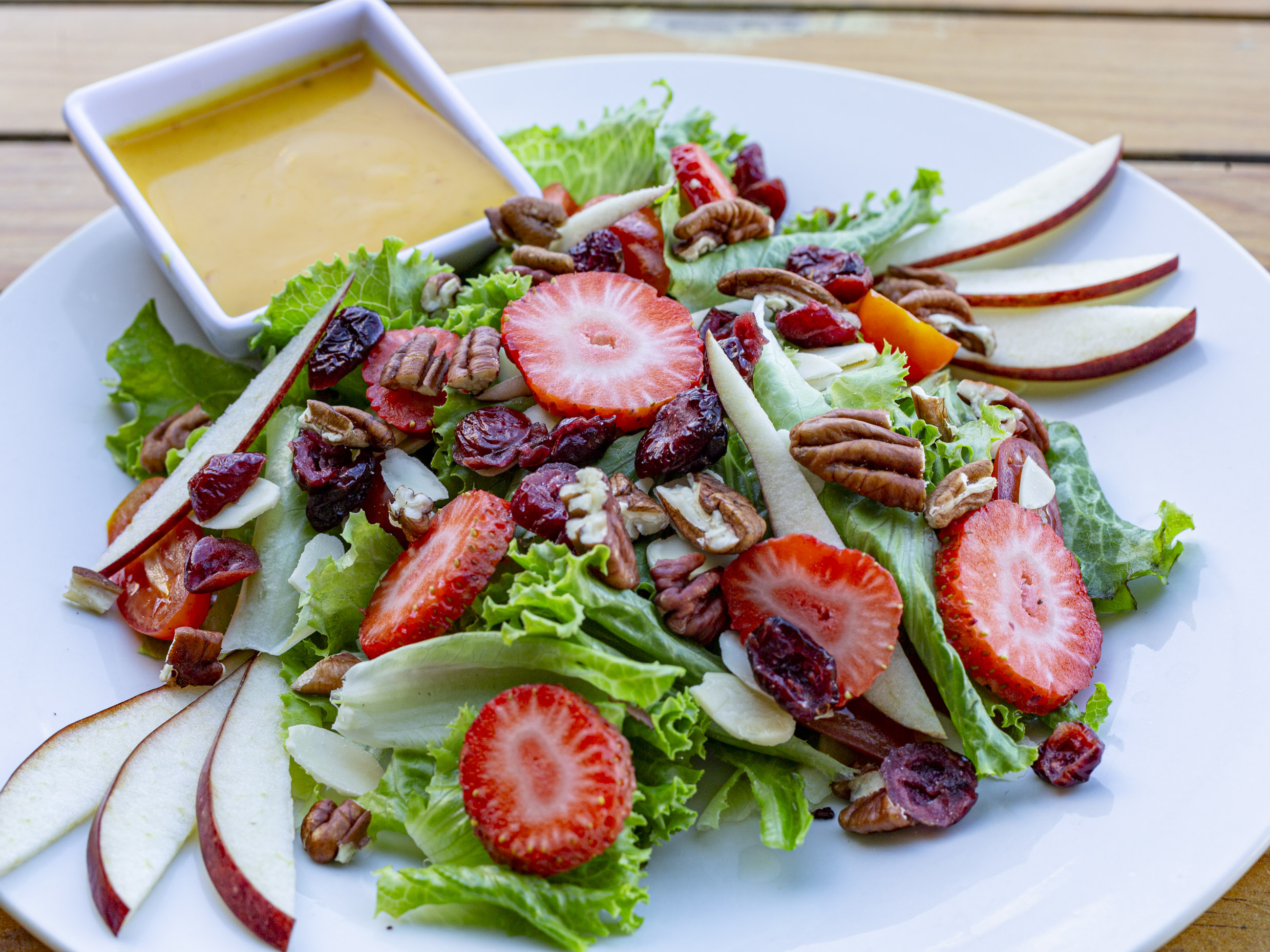 Lechuga italiana, fresa, arándanos, manzana, jitomate cherry, almendra y nuez.