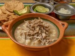 Grano de maíz y frijol‚ acompañado de carne de pollo o cerdo. Incluye tostadas, aguacate y chicharrón.