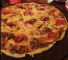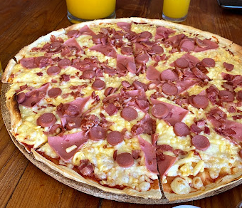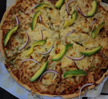 Si, deliciosos chilaquiles en una pizza, chilaquiles rojo, cebolla, queso gratinado y aguacate.