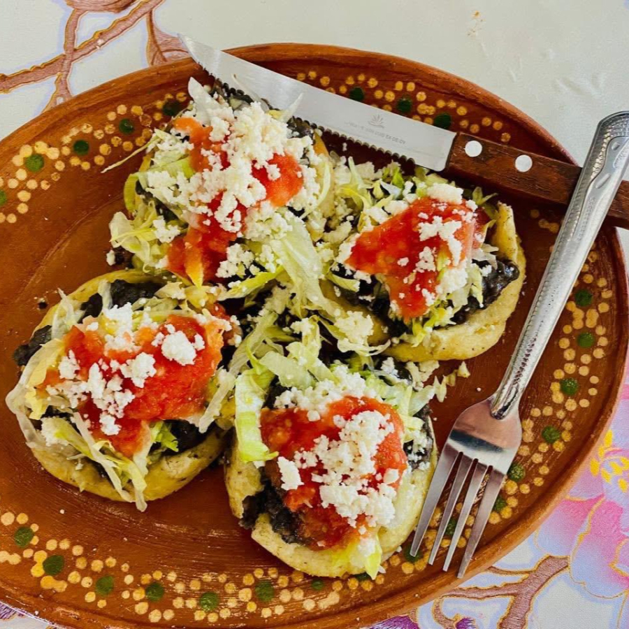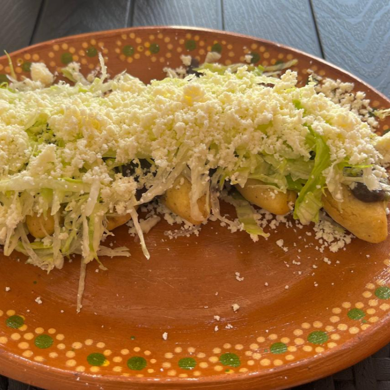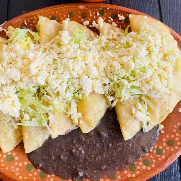 6 tortillas fritas cubiertas con frijoles refritos, acompañadas de lechuga, queso fresco y salsa a elegir.