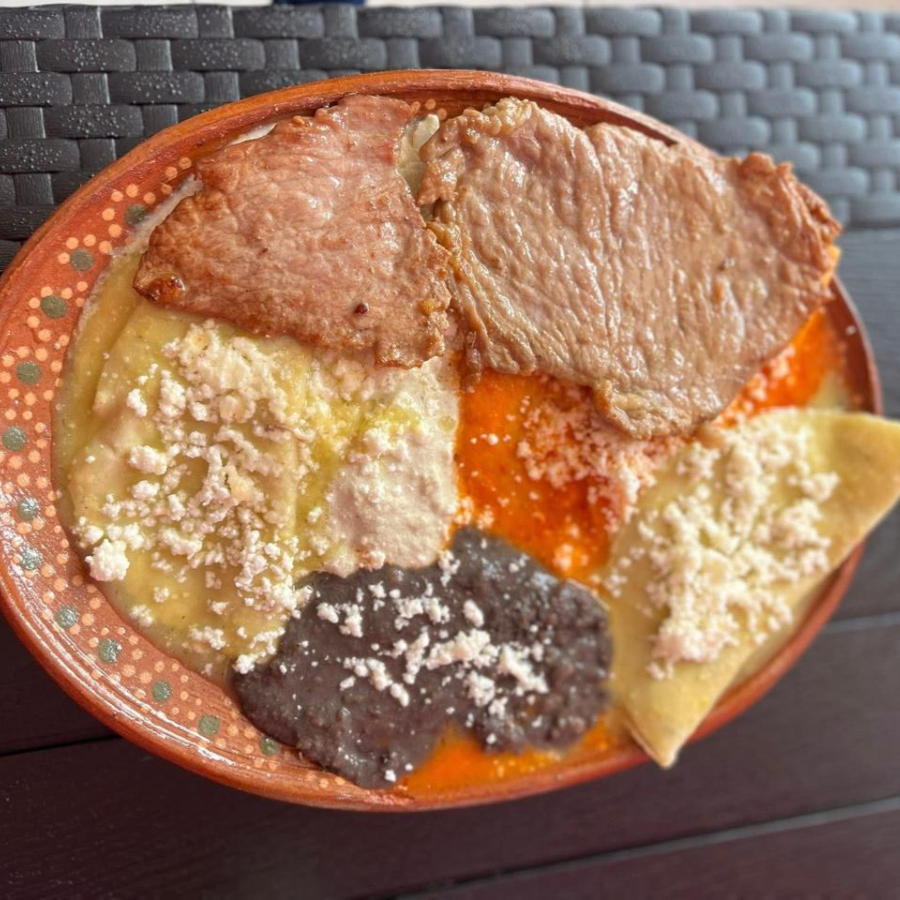 6 tortillas hechas a mano bañadas en salsa verde, roja y pipián.