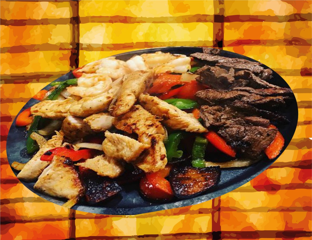 Arrachera, fajitas de pollo y chorizo. Todas las parrilladas y combo incluyen frijole charros, nopalitos con cebolla, tortillas y salsas en porción al tamaño de su elección, papás a la francesas.