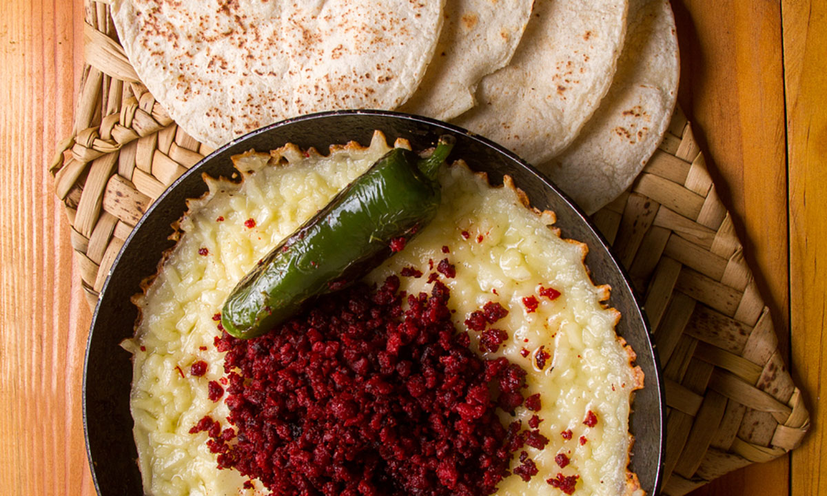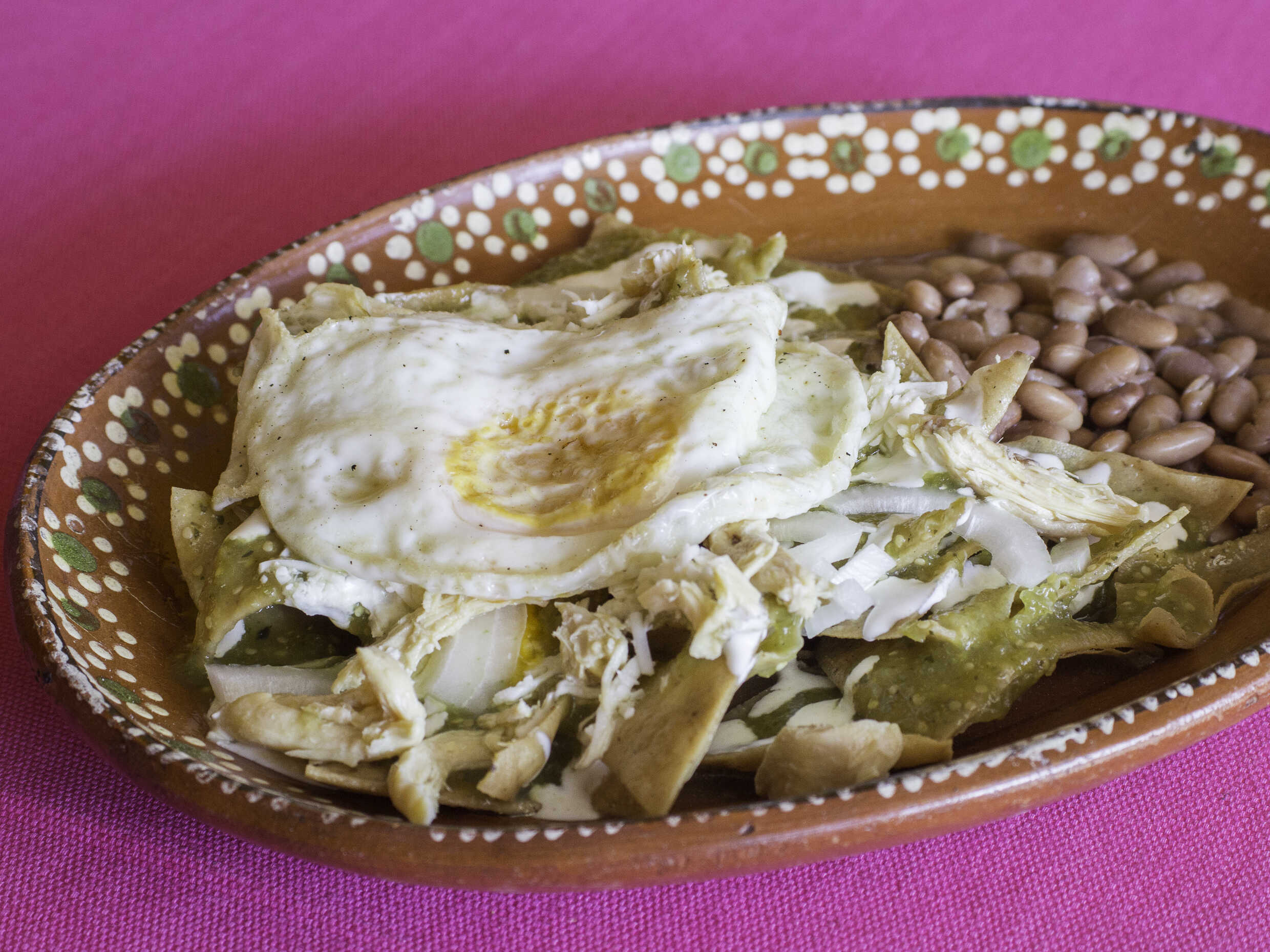 Chilaquiles tradicionales, crema, queso y arrachera.