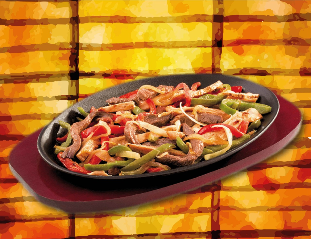 Arrachera, fajitas de pollo y chorizo. Todas las parrilladas y combo incluyen frijole charros, nopalitos con cebolla, tortillas y salsas en porción al tamaño de su elección, papás a la francesa.