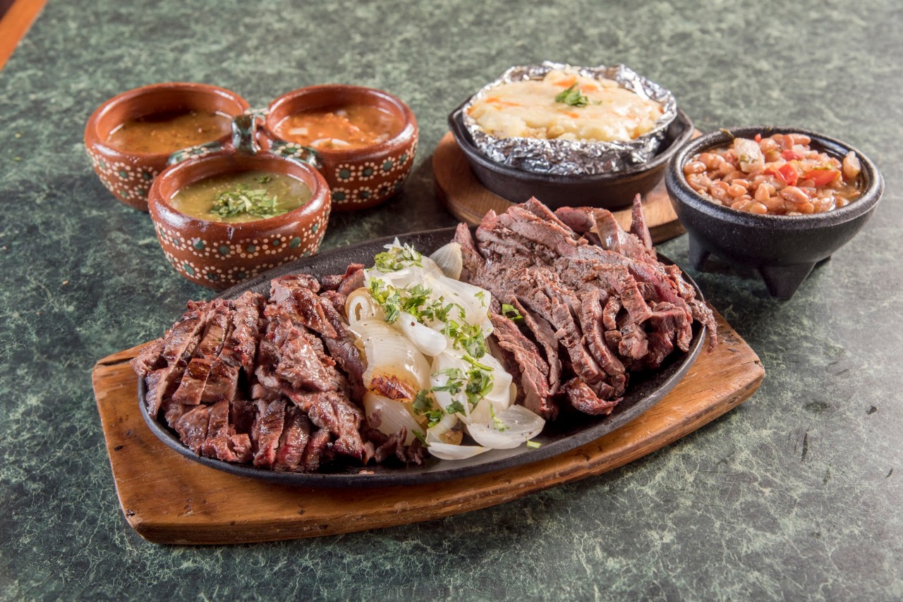 Arrachera, fajitas de pollo y chorizo. Todas las parrilladas y combo incluyen frijoles charros, nopalitos con cebolla, tortillas y salsas en porción al tamaño de su elección, papás grandes y chicas a la francesa.