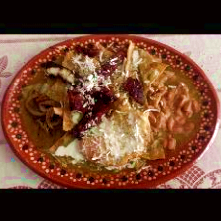 Generosa porción de chilaquiles con Arrachera acompañados de frijoles y cebollita caramelizada incluye huevo, salsa a elegir