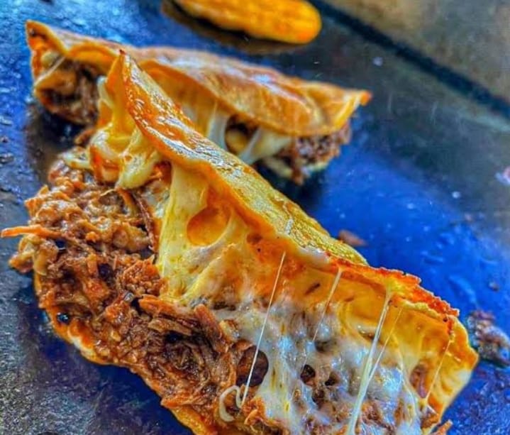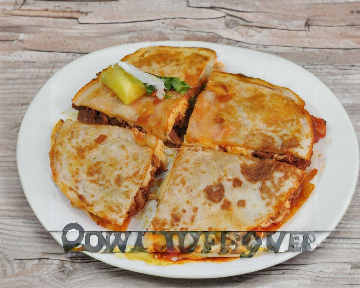 Quesadilla gringa con carne a elegir, acompañados de cilantro, salsa y limones. Se cuenta con diferentes tipos de salsas, chile de árbol, chile serrano, chile chipotle con morita, piña con habanero y cacahuate.