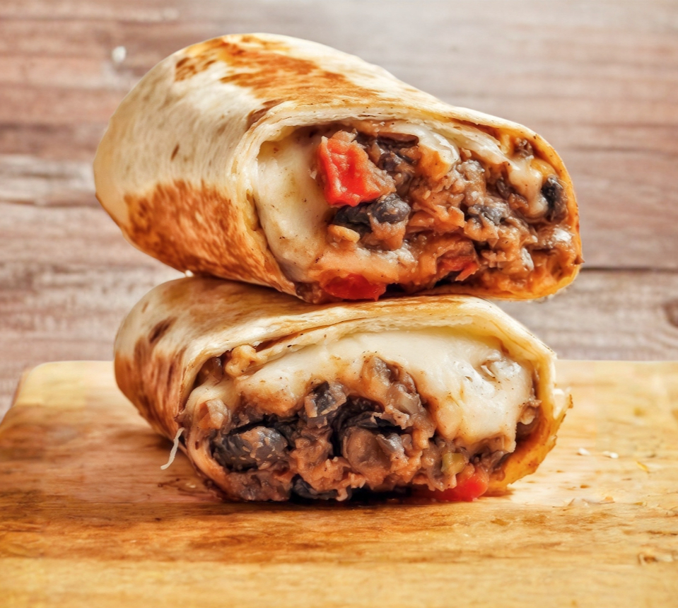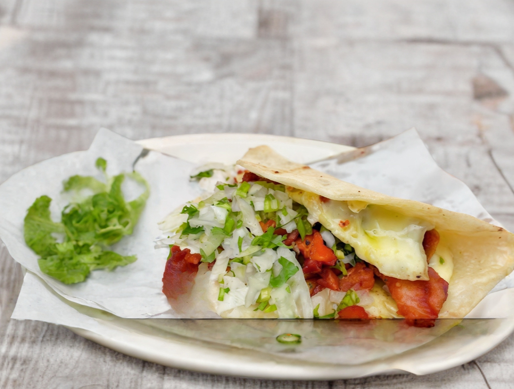 Burritos, acompañados de cilantro, salsa y limones. Se cuenta con diferentes tipos de salsas, chile de árbol, chile serrano, chile chipotle con morita, piña con habanero y cacahuate.