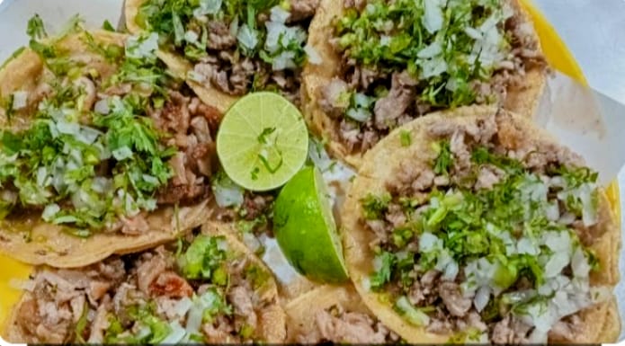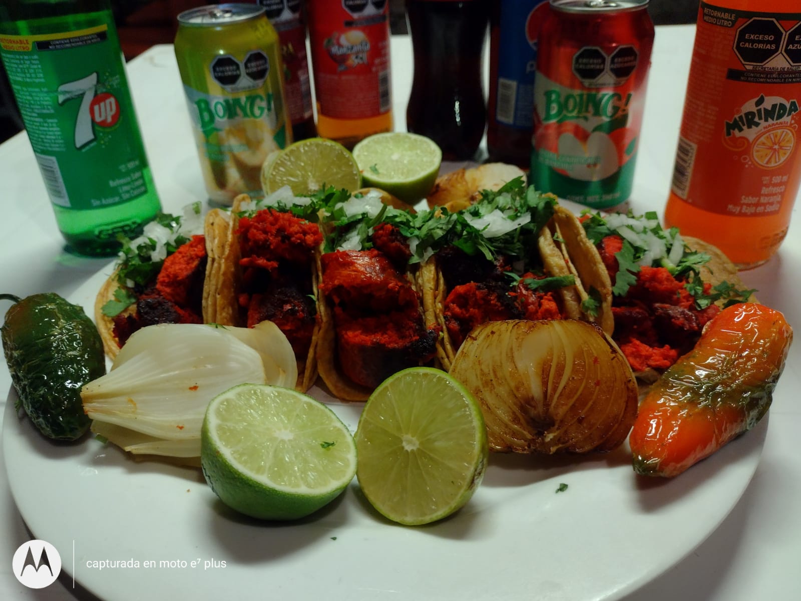 Taco de adobado, doble tortilla, acompañados de cilantro, salsa y limones, se cuenta con diferentes tipos de salsas, chile de árbol, chile serrano, chile chipotle con morita, piña con habanero y cacahuate.
