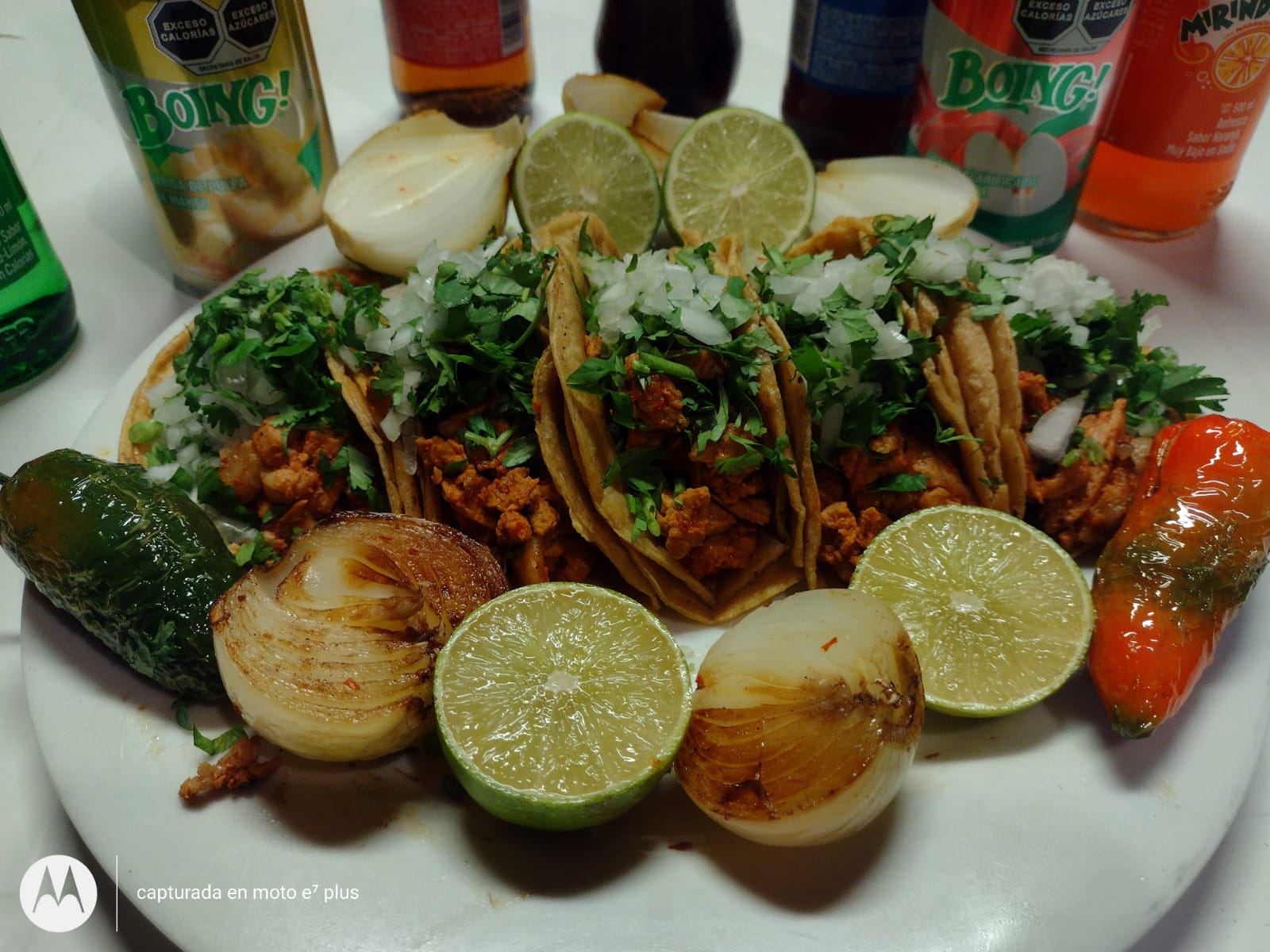 Taco de pastor, doble tortilla, acompañados de cilantro, salsa y limones. Se cuenta con diferentes tipos de salsas, chile de árbol, chile serrano, chile chipotle con morita, piña con habanero y cacahuate.