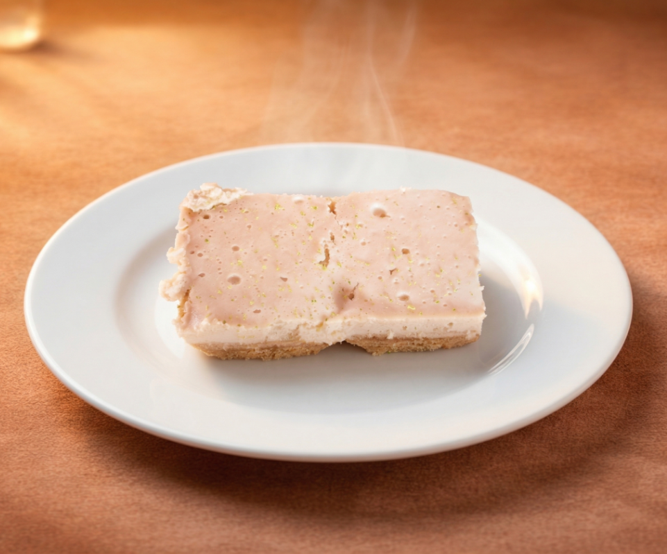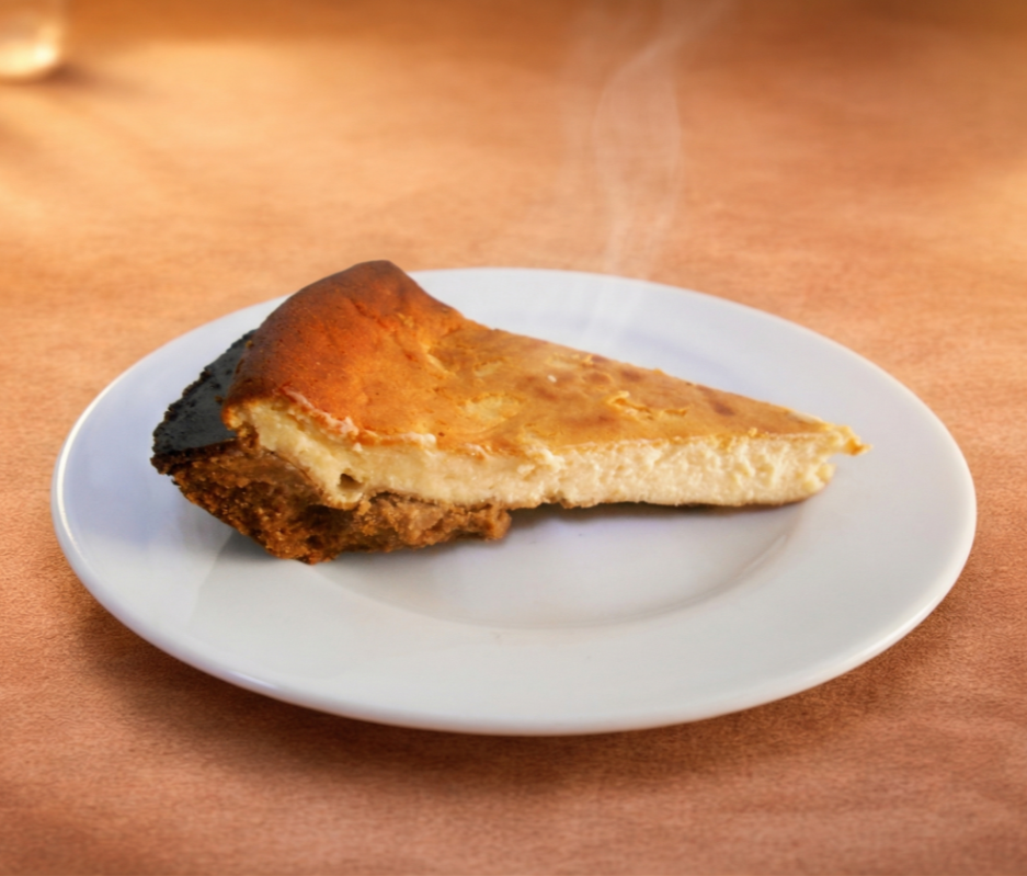 Clásico pie de queso horneado sobre una base crujiente de galleta.