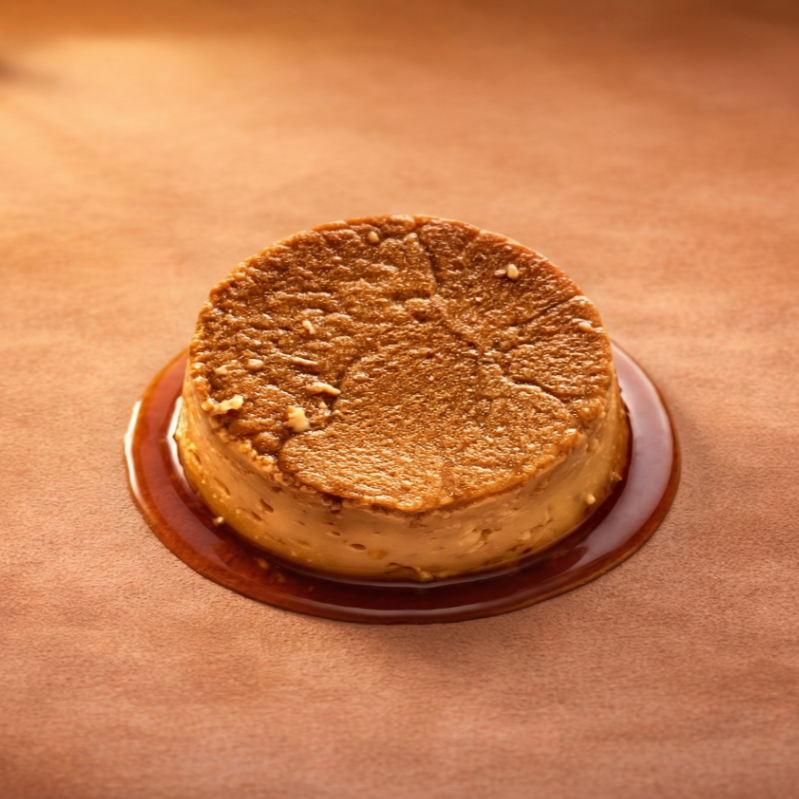 Flan casero de textura firme y suave con un baño de caramelo artesanal.