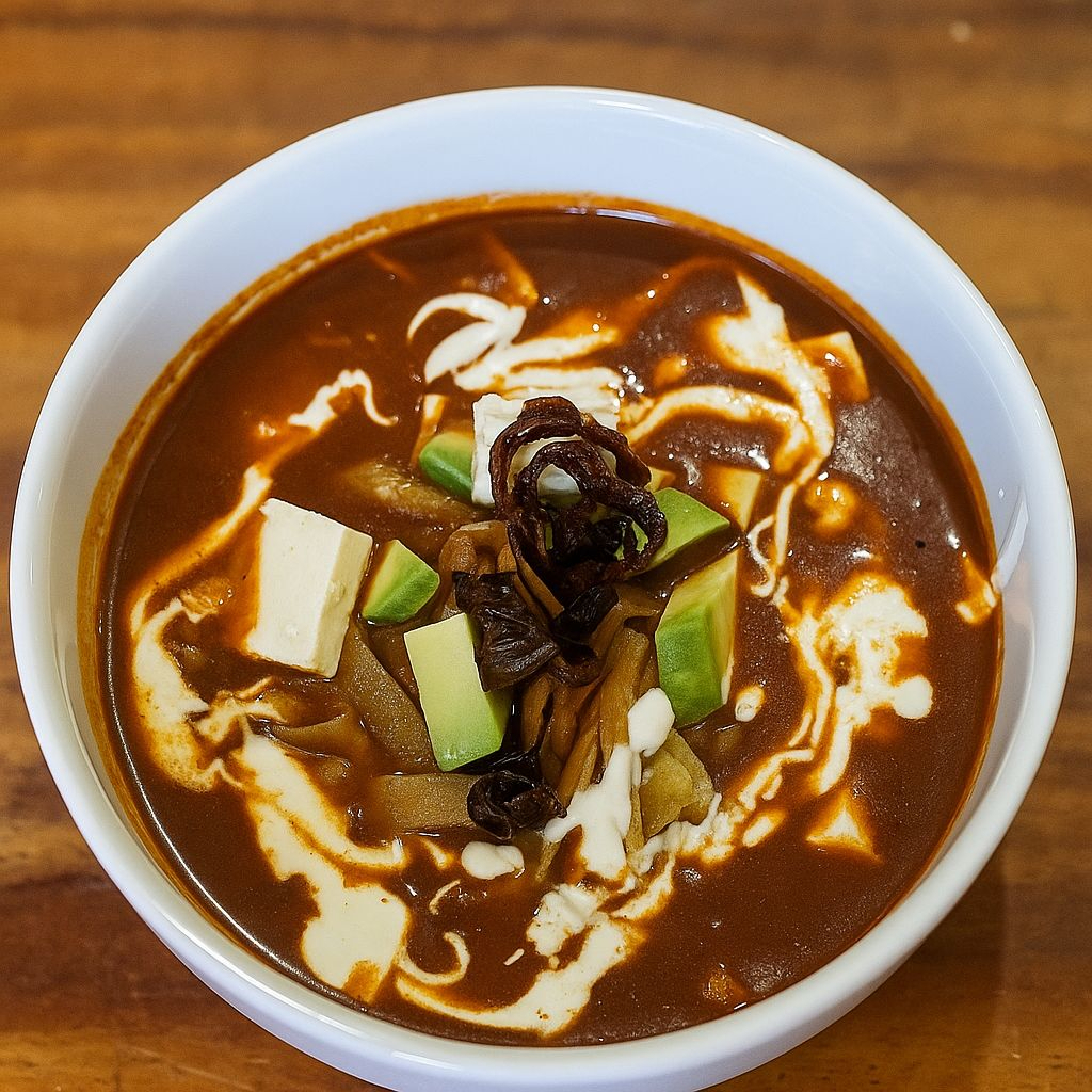 Sopa de tortilla con un toque de chile pasilla, contiene queso, aguacate, crema y chile ancho tostado. 500 ml