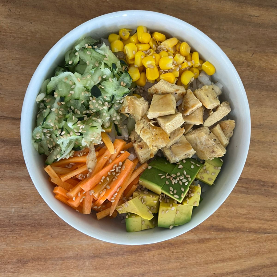 Bowl con base de arroz al vapor, Pepino, Zanahoria, Elotitos, Aguacate, Ajonjolí, Pollo en Grill