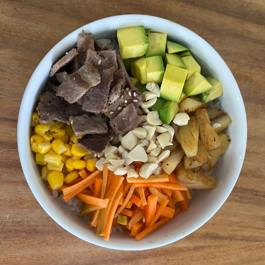 Bowl con base de arroz al vapor, Piña asada, Elotitos, Zanahoria, Aguacate, Nuez caramelizada y Bistec Grill