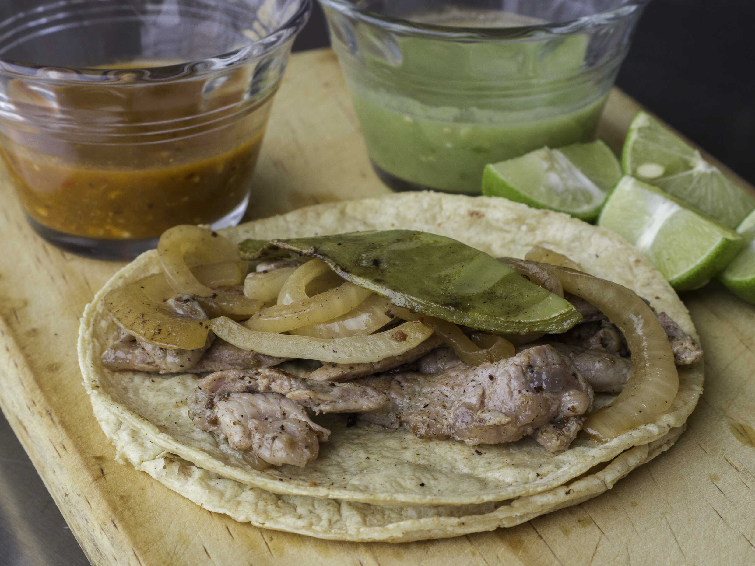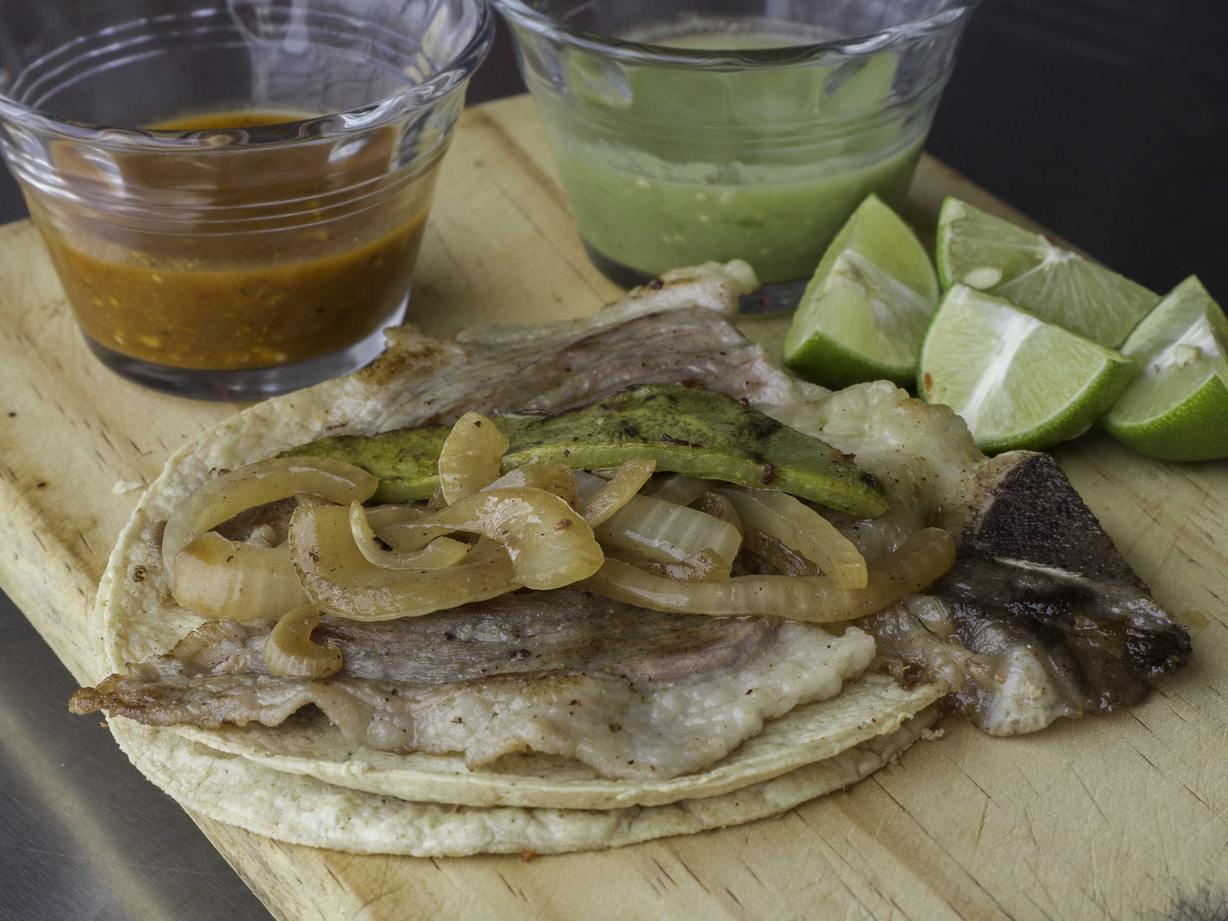 Tortilla grande, corte aguja norteña, acompañada con cebolla asada ,nopal, salsas y limones.