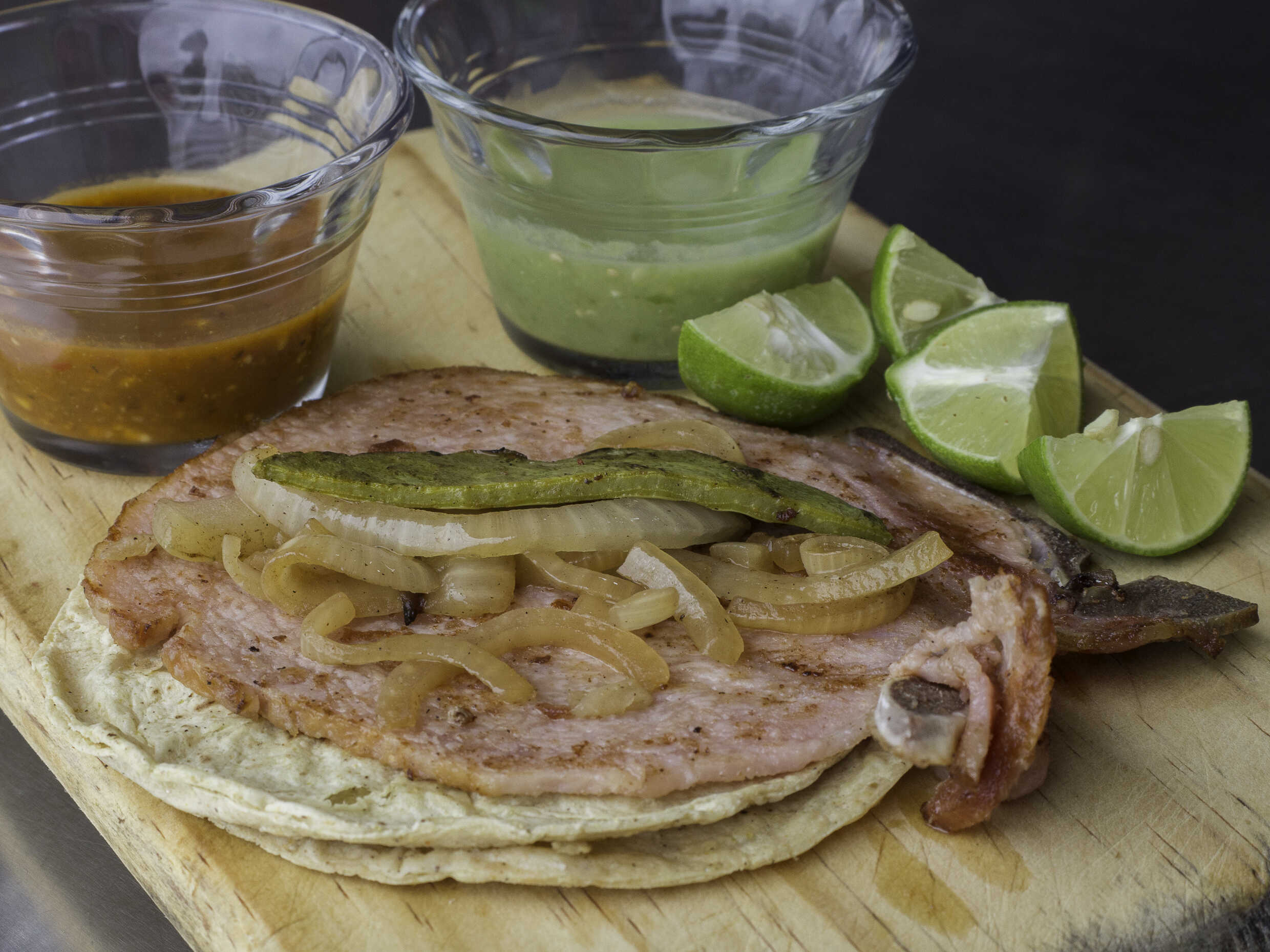 Tortilla grande, chuleta ahumada, acompañada con cebolla asada ,nopal, salsas y limones.