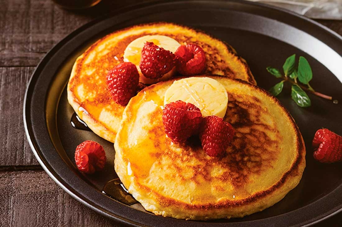 Hot cakes rellenos de chispas de chocolate acompañado con 2 ingredientes , elije y ESPECIFICA si gustas lechera, miel, hershey´s o mermelada y platano, fresa, chispas de chocolate o colores. Indica tus 2 ingredientes de favor.