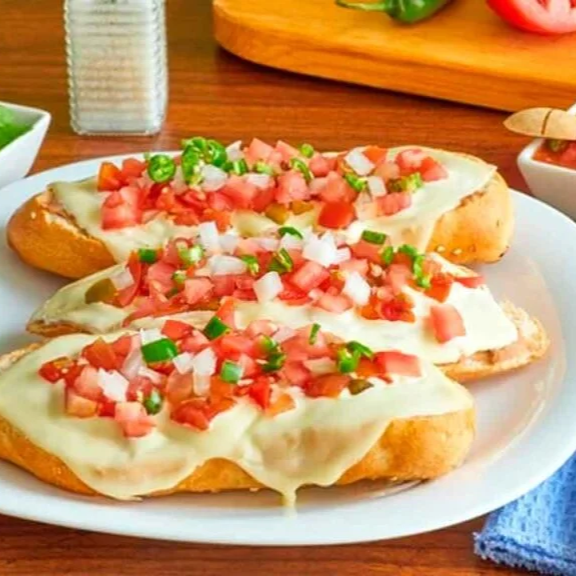 2 piezas de molletes con frijoles, queso derretido, jamon o chorizo con pico de gallo y salsa.