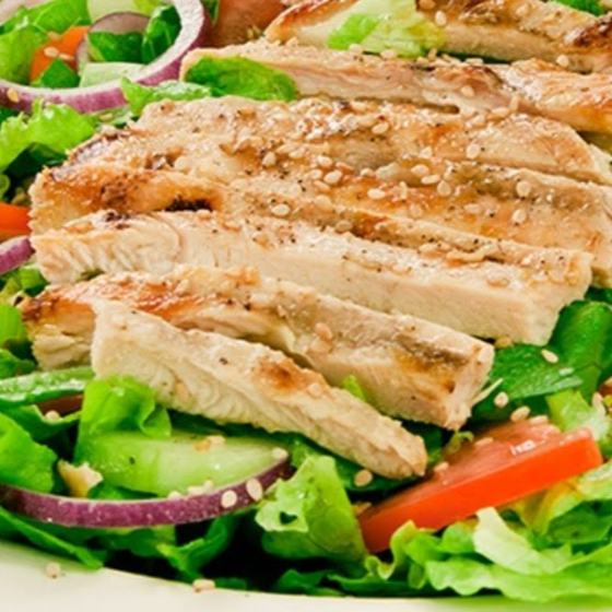Ensalada que lleva lechuga roamana, orejona, zanahoria, pepino, jicama, crotones, aderzo y pollo a la plancha,