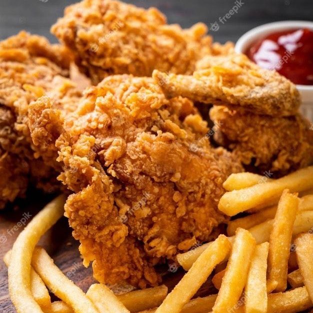 5 Trozos de pollo empanizado bañados en salsa al gusto con 100gr de papas.