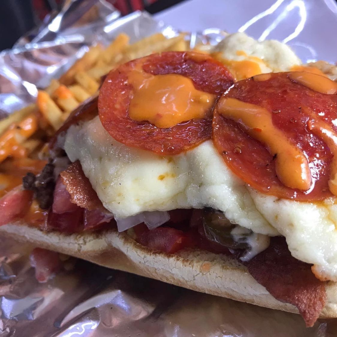 Salchicha de pavo , tocino, jitomate, mayonesa , catsup , queso mozzarella y peperoni + 100 gr de papas a la francesa