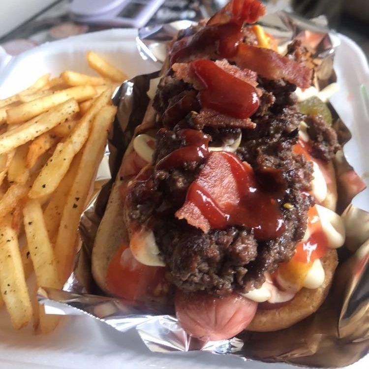 Salchicha de pavo, tocino, carne a la plancha sirloin, aguacate, aderezo de chipotle, jitomate, cebolla, jalapeño, cátsup, mostaza, mayonesa y 100gr de papas a la francesa.
