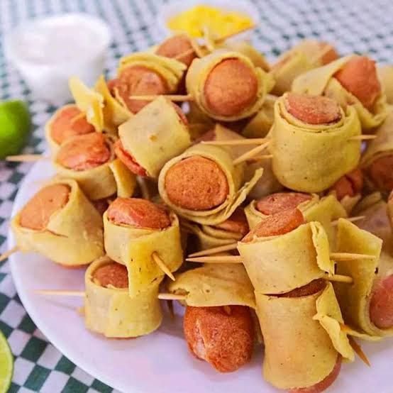 Trozos de salchicha envueltos en tortilla de harina.