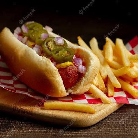 Salchicha de pavo, tocino, jitomate, cebolla, jalapeño, cátsup, mostaza, mayonesa + 100gr de papas a la francesa