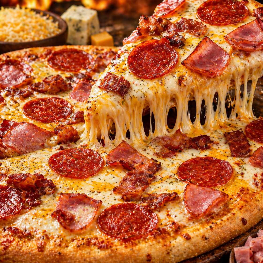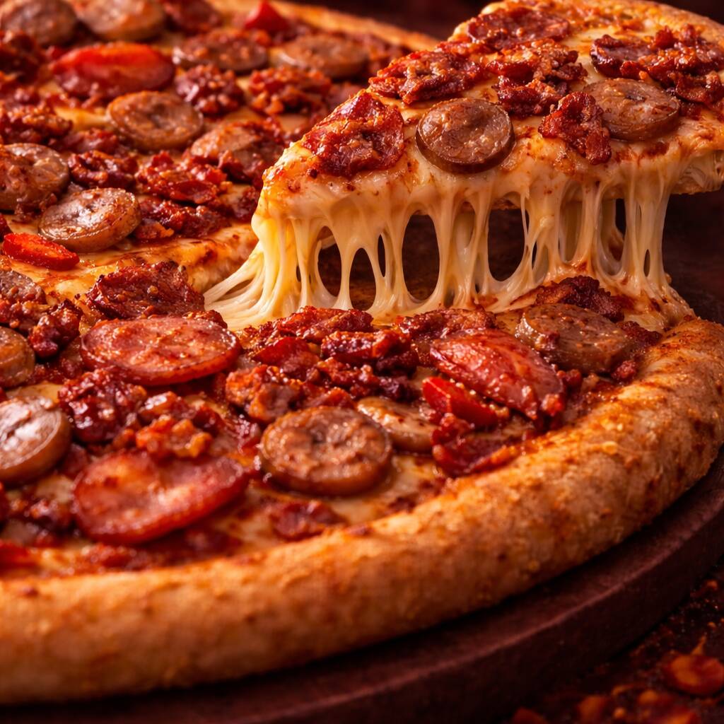 La más poderosa del menú: pepperoni doradito 🍕, tocino crujiente 🥓 y jamón jugoso 🍖, combinados con una mezcla irresistible de 4 quesos derretidos 🧀🤤 que hacen hebra en cada rebanada. El sabor es intenso y cremoso: la fuerza de las carnes con la suavidad y explosión de queso que lo cubre todo 🔥🧀 👉 Perfecta si buscas una pizza cargada, ultra quesosa y totalmente adictiv
