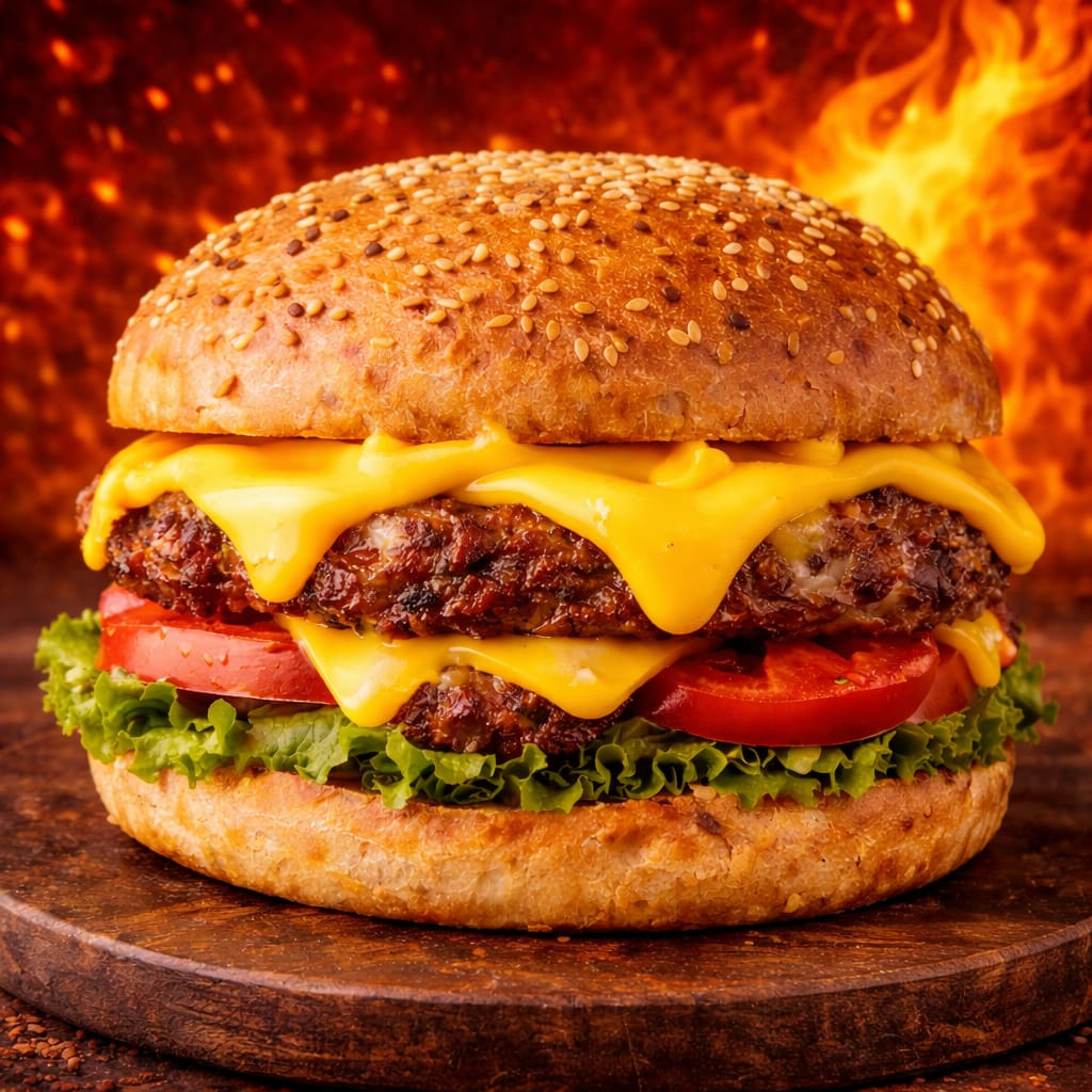 Hamburguesa Sirlon Doble Carne Triple Queso. Hamburguesa Fogo 🍔🔥 Jugosa carne a la parrilla acompañada de abundante queso artesanal Fogo, perfectamente fundido para un sabor intenso y cremoso. Servida con pan suave, vegetales frescos y ese toque que solo Fogo sabe dar. Ideal para cuando quieres algo bien cargado, bien servido y sin fallas. Pídela y siente el sabor que quema.