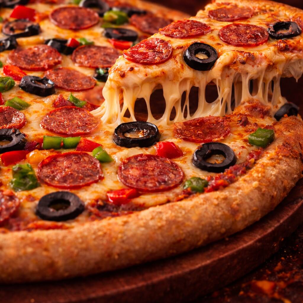 🔥Una combinación que nunca falla: pepperoni doradito, pimiento fresco y aceitunas negras que le dan ese toque ligeramente salado y delicioso. Todo sobre una base de queso abundante fundido que estira en cada rebanada.🍕🔥