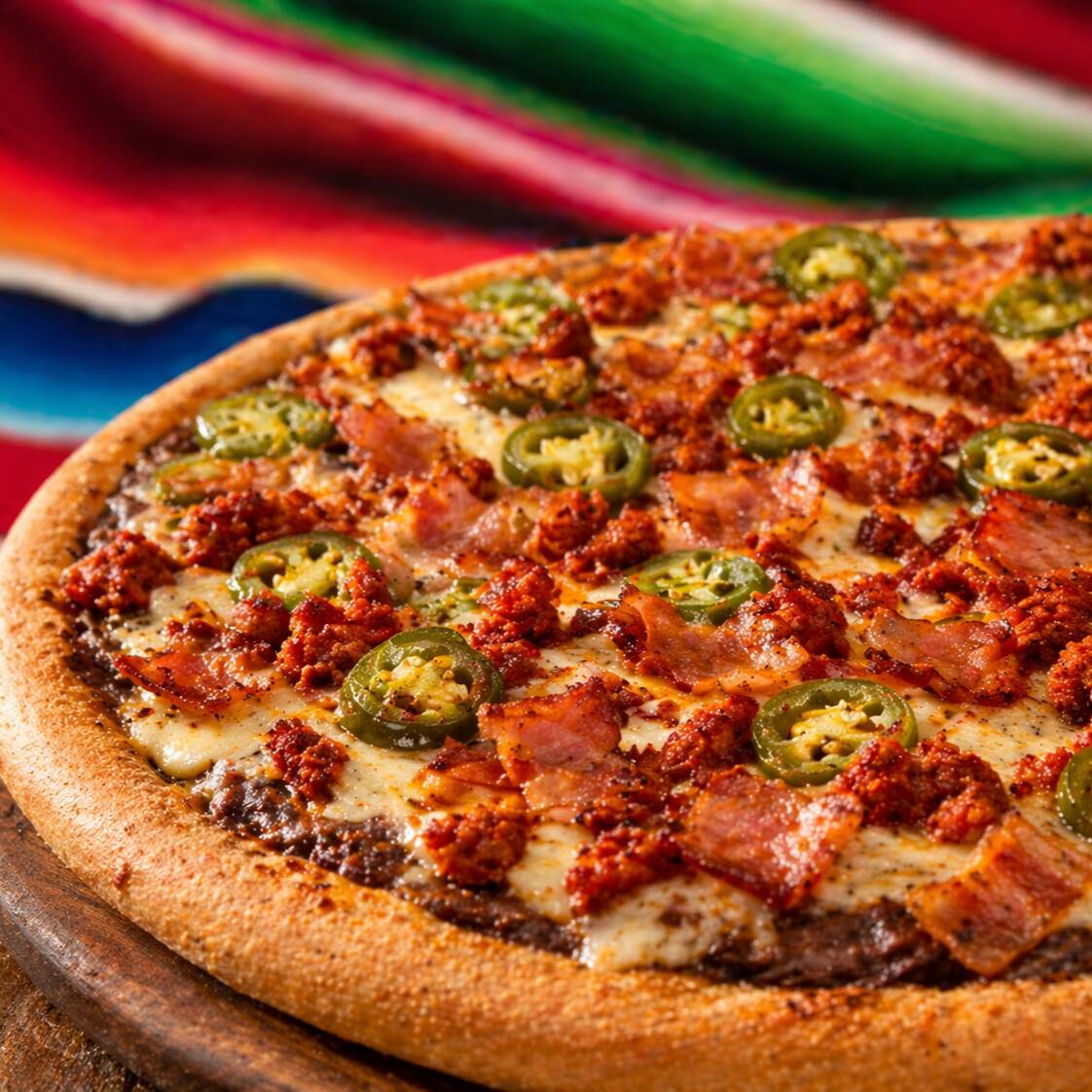 Una pizza con puro carácter: base de frijol bien sazonado 🫘, cubierta con chorizo intenso 🌶️, tocino crujiente 🥓 y jalapeños picositos 🌶️, todo sobre una capa de queso fundido que se estira en cada mordida 🧀🤤 🍕 🟢⚪🔴 🦅 El sabor es fuerte, picosito y súper mexicano: la combinación del frijol con el chorizo y el toque ahumado del tocino crea una explosión de sabor que no falla