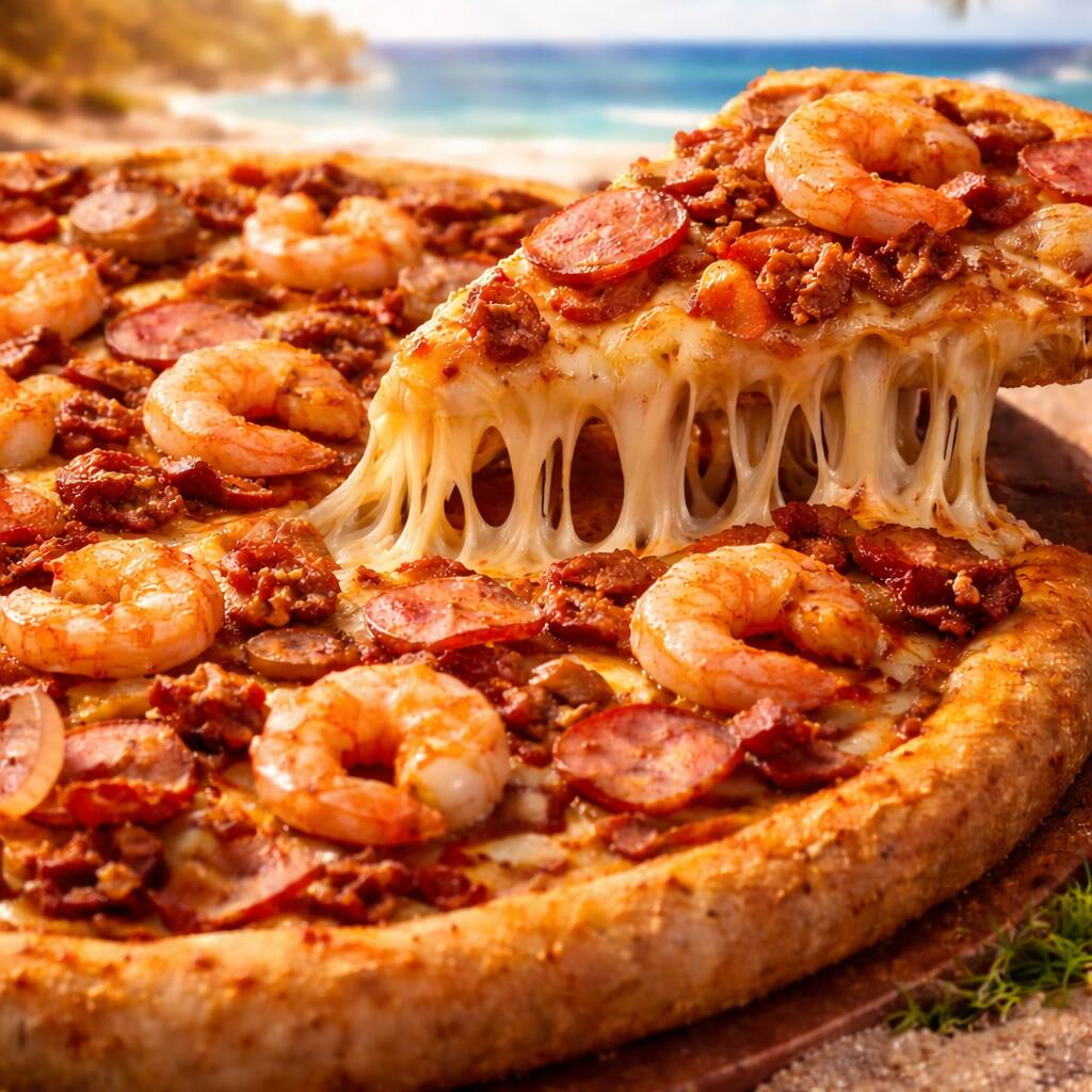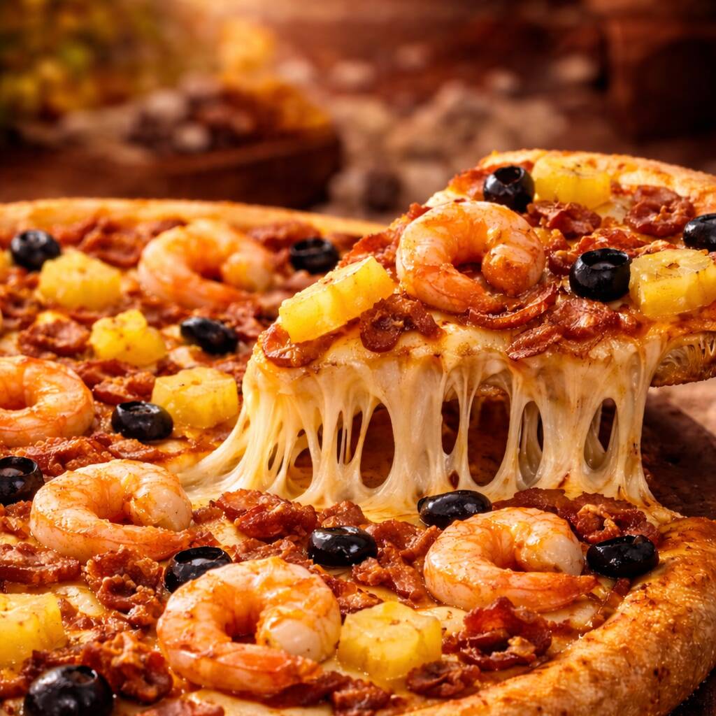 Una combinación atrevida y deliciosa: camarón jugoso 🍤, piña dulce 🍍, aceitunas negras 🖤 y tocino crujiente 🥓, sobre una base de queso fundido que se derrite en cada mordida 🤤🧀🔥 El sabor es una mezcla perfecta entre lo dulce y lo salado: la frescura del camarón, el toque tropical de la piña y el contraste intenso del tocino y las aceitunas ❤️🔥🔥 👉 Ideal si te