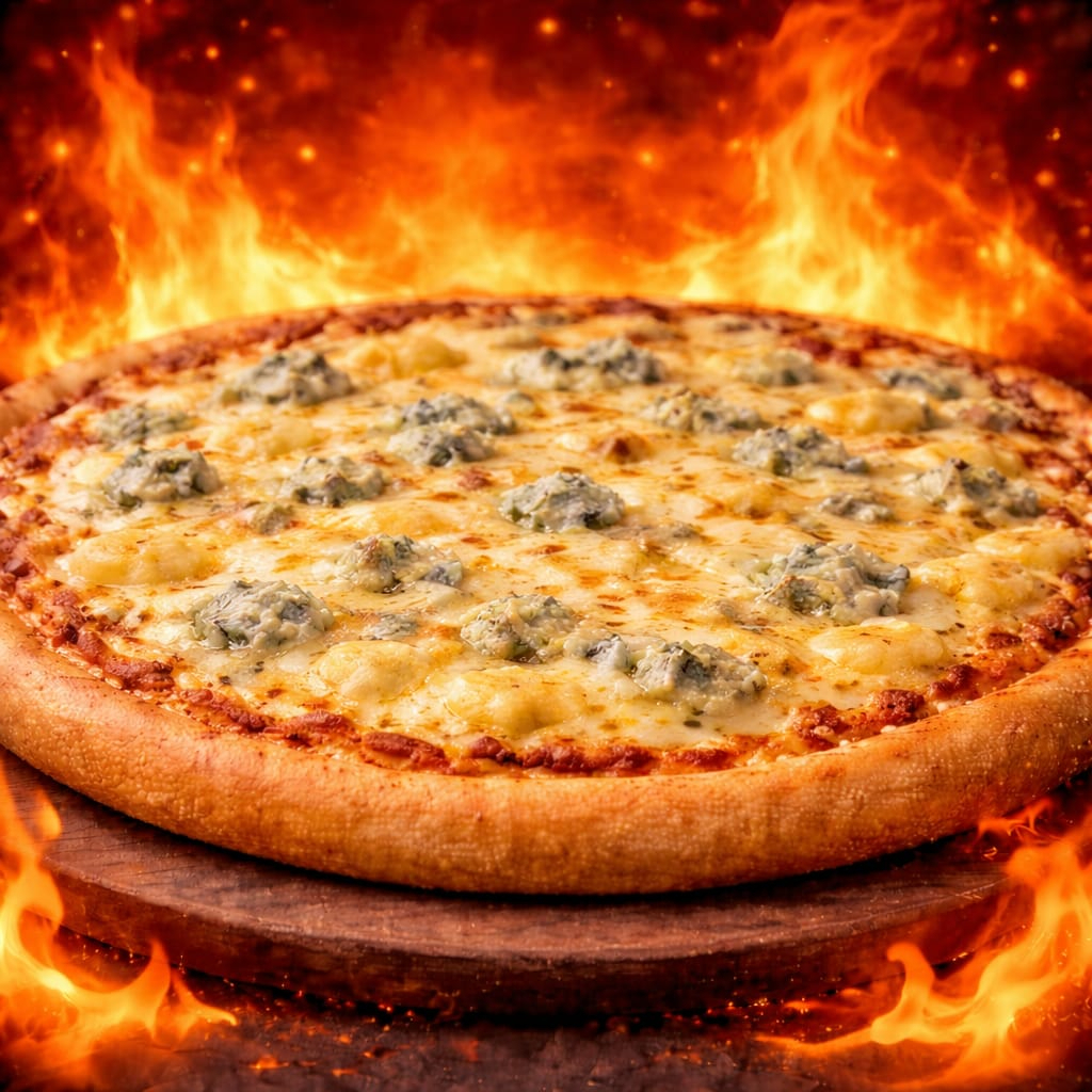 Una explosión de sabor para los amantes del queso: mezcla perfecta de gouda cremoso 🧀, mozzarella fundida 🧀, manchego intenso 🧀 y el toque especial de queso Fogo (receta secreta) 🤫🔥 Cada rebanada es pura cremosidad, con una textura suave que se derrite y hace hebra en cada mordida 🤤🧀 👉 Ideal si eres fan del queso en serio… esta pizza es otro nivel 😍🔥🍕