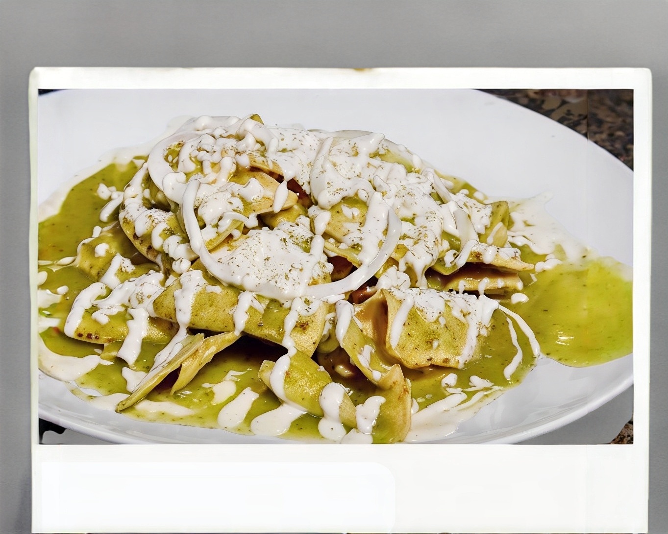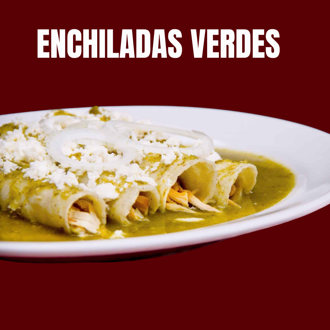 4 piezas de enchiladas rellenas de pollo o queso con crema, queso y aguacate frijoles. Salsa verde