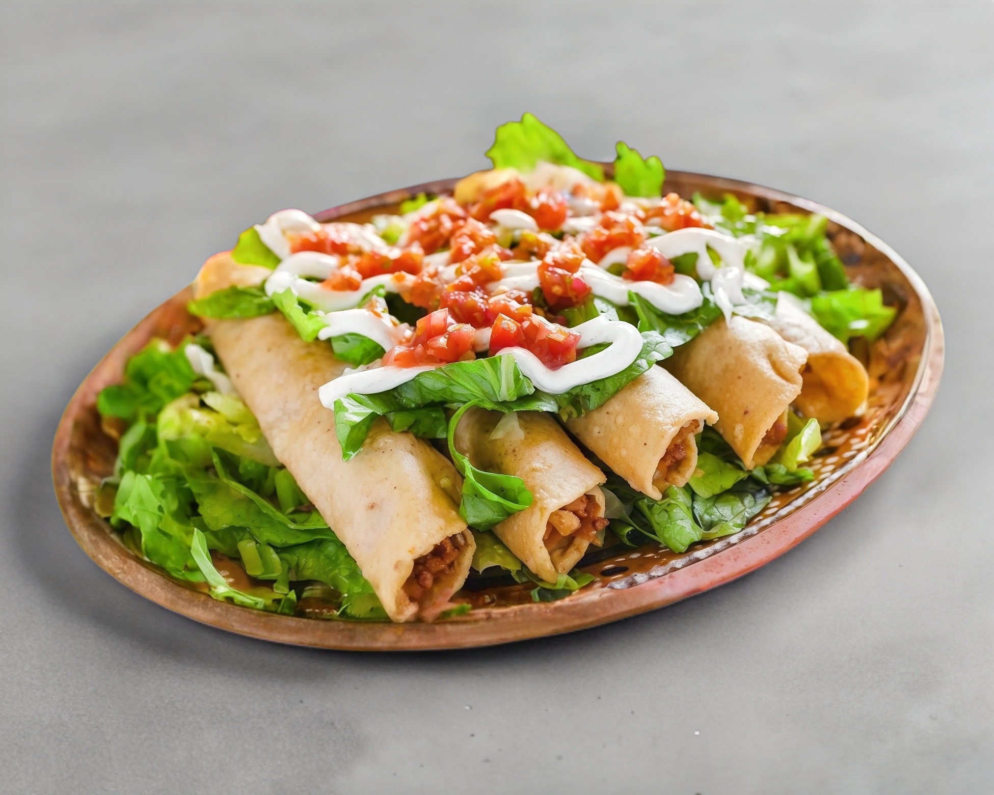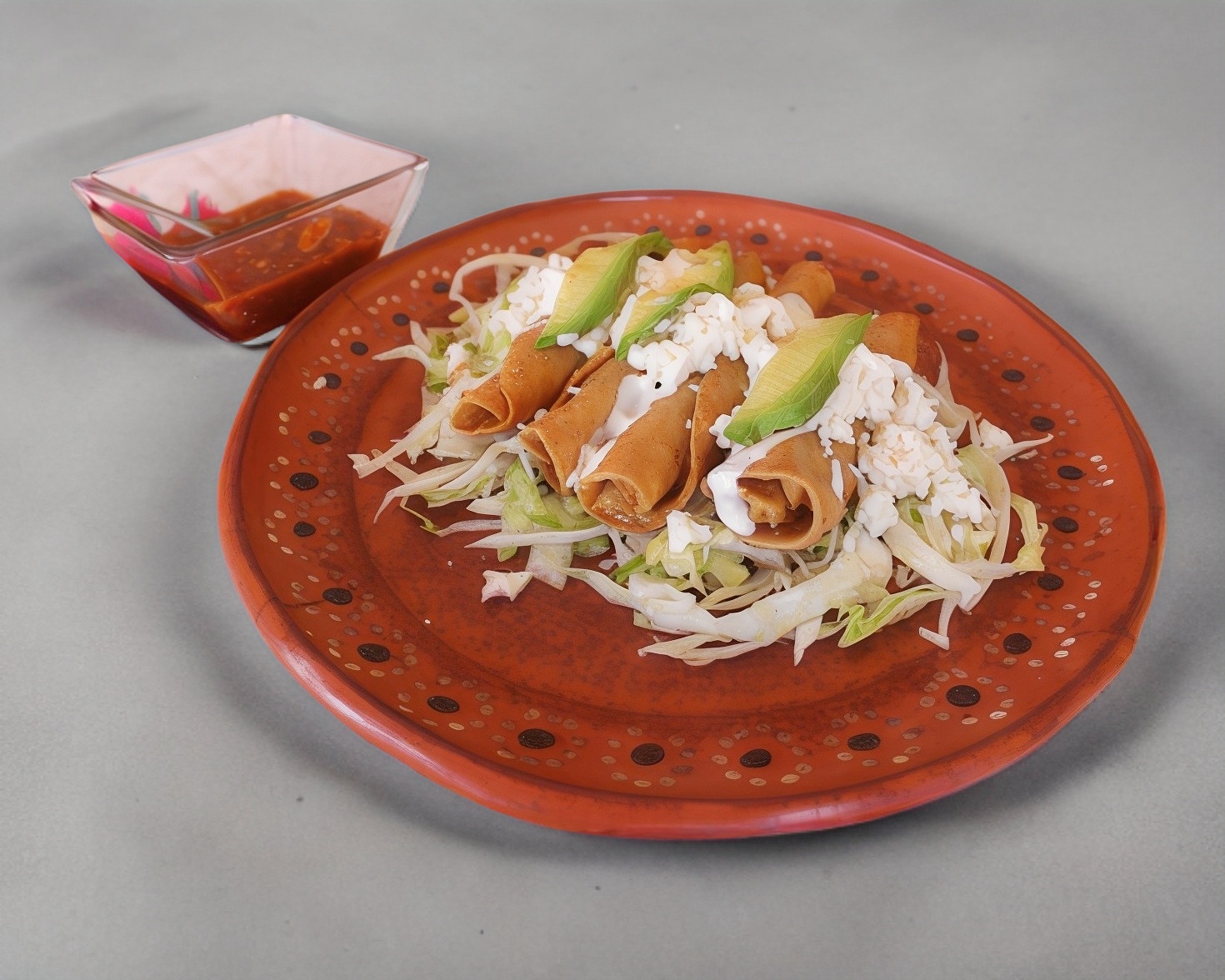 4 tacos dorados con lechuga, salsa crema y queso y frijoles