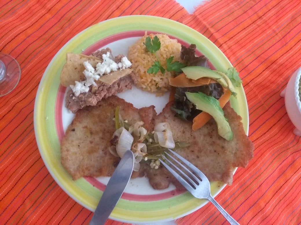 milanesa de pollo o cerdo con arroz y frijoles y ensalada