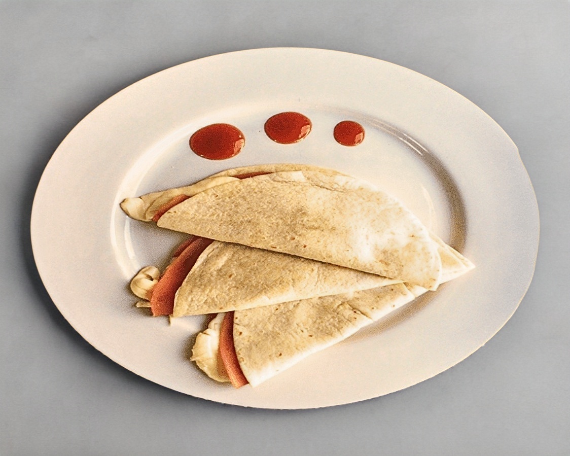 2 quesadillas de doble tortilla de harina con jamón y queso asadero, acompañado de pico de gallo y chiles en vinagre