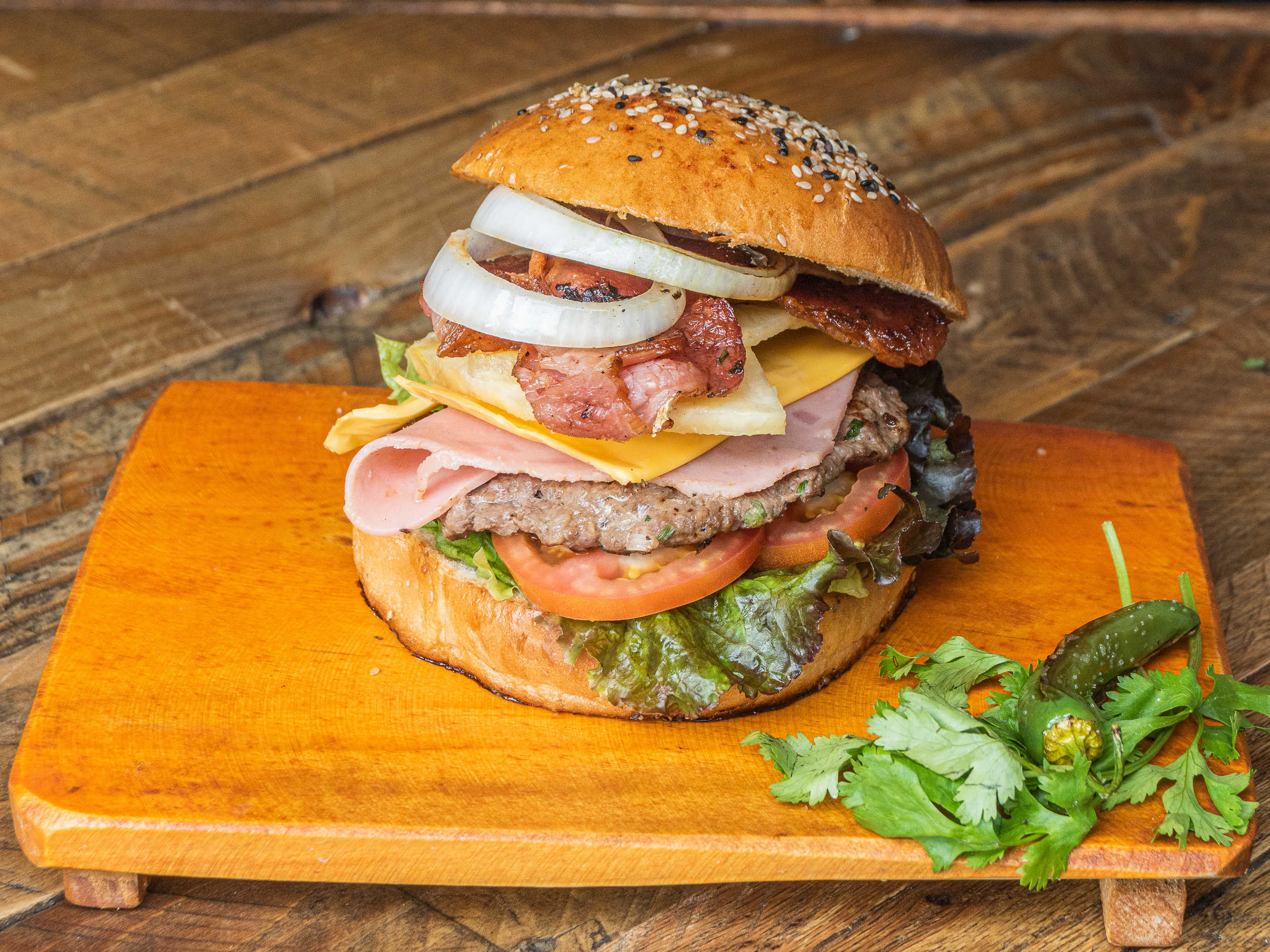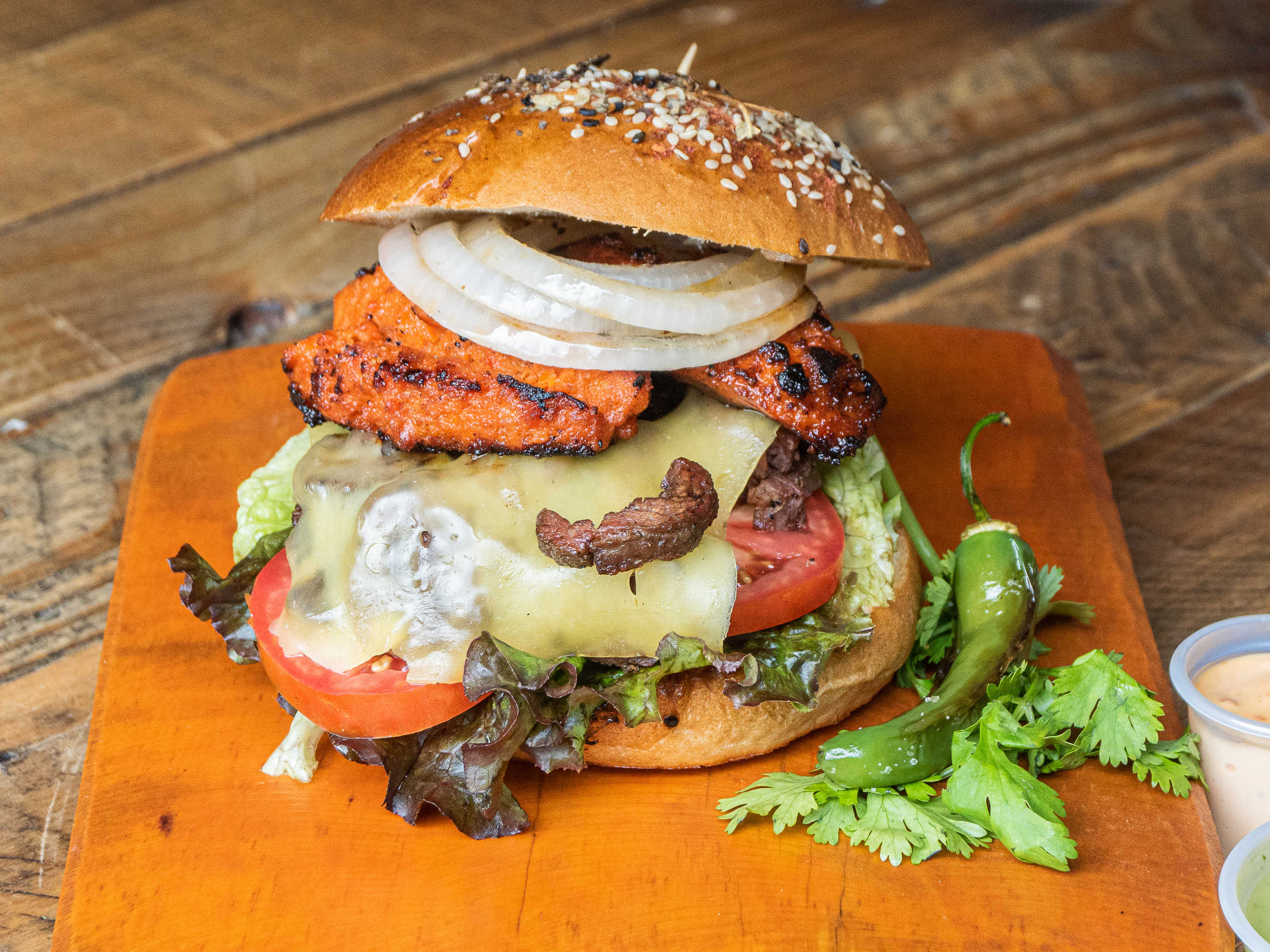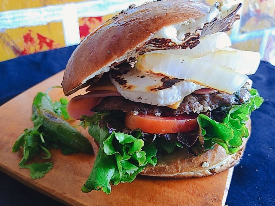 Carne de res marinada, pan artesanal, lechuga, jitomate, jamón, queso americano y aderezo picante de la casa.