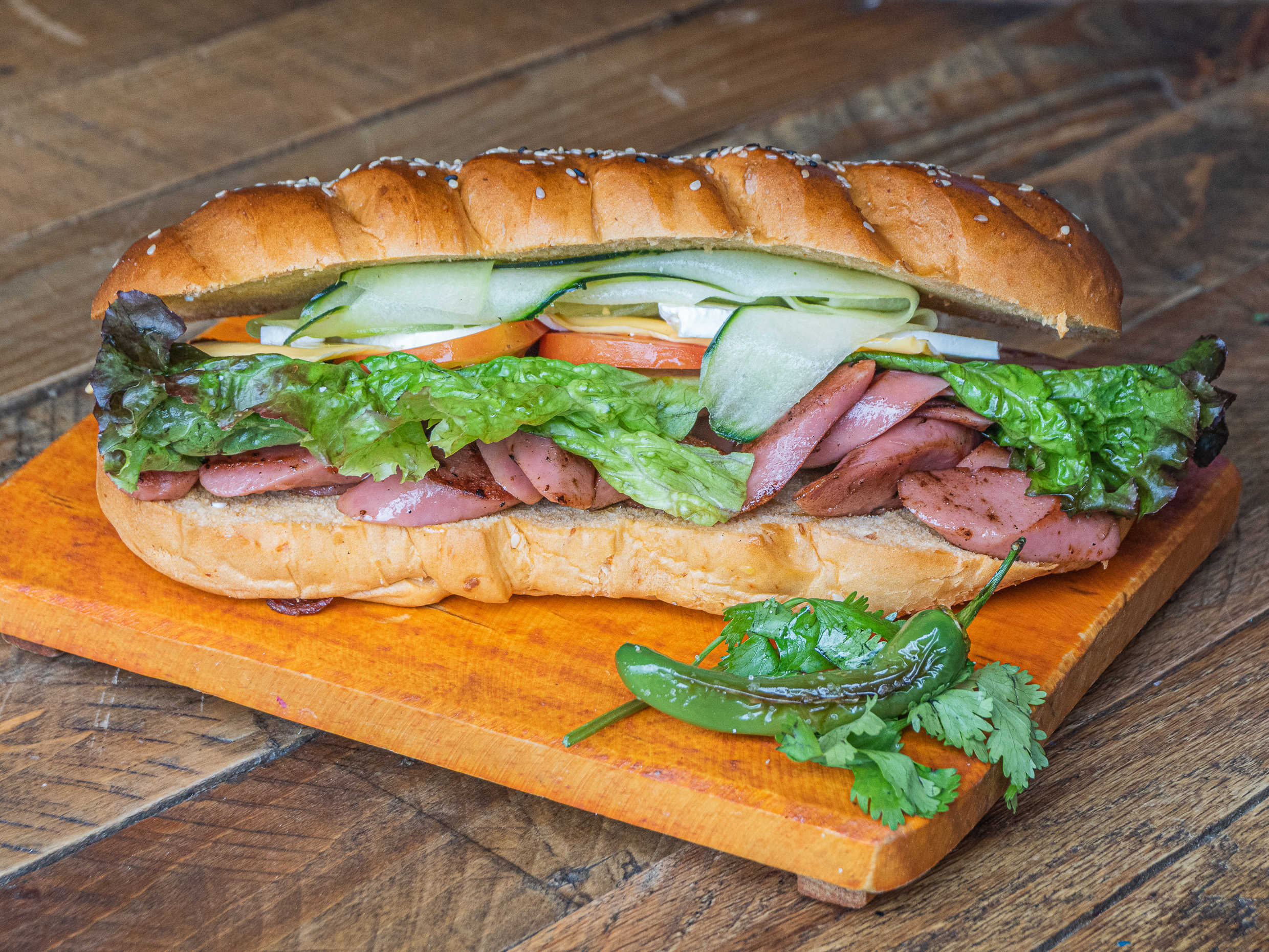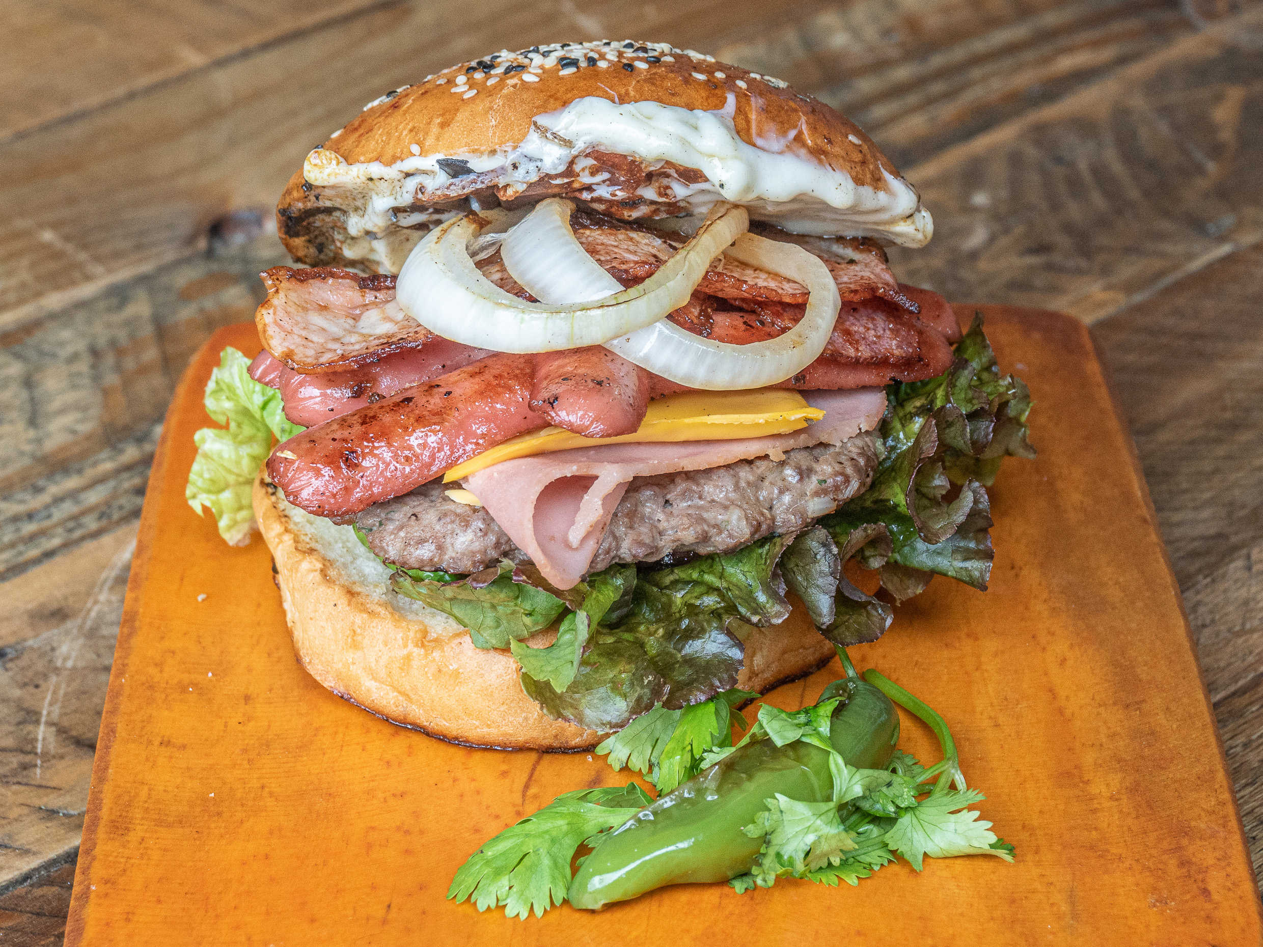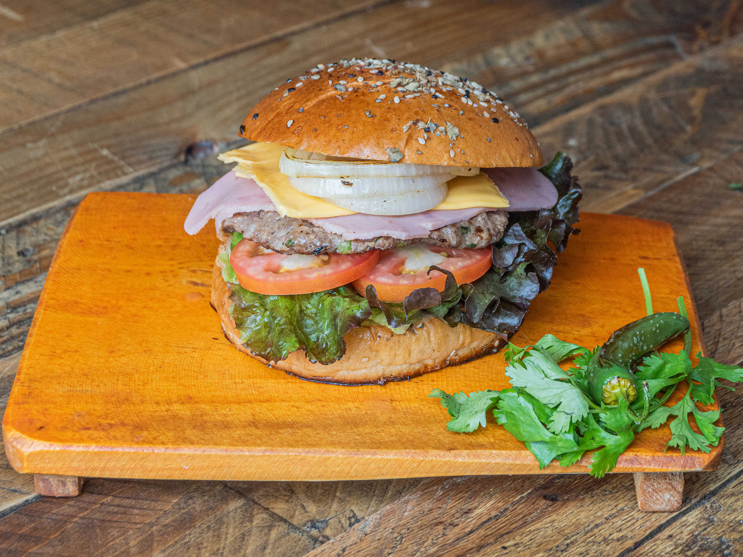 Carne de res marinada, pan artesanal, lechuga, jitomate, jamón, queso americano y aderezo picante de la casa.