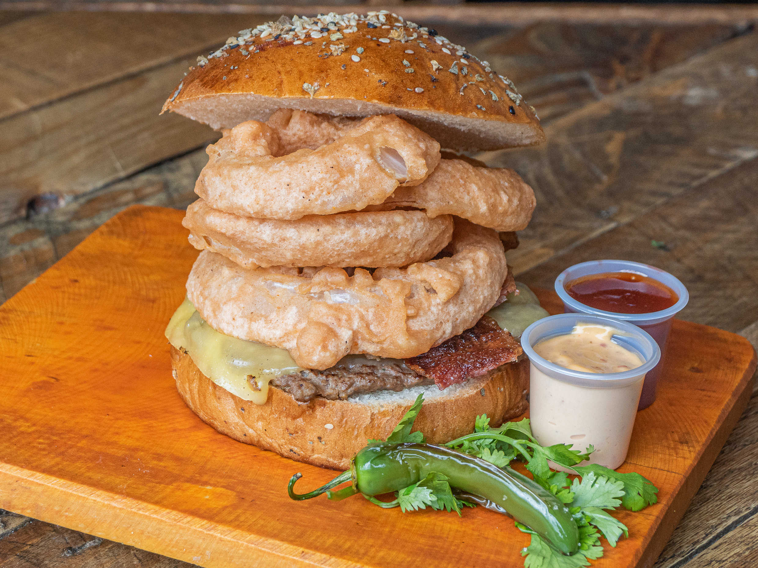 Pan de la casa, carne de res, aros de cebolla, queso manchego, tocino, aderezo de la casa y salsa BBQ.