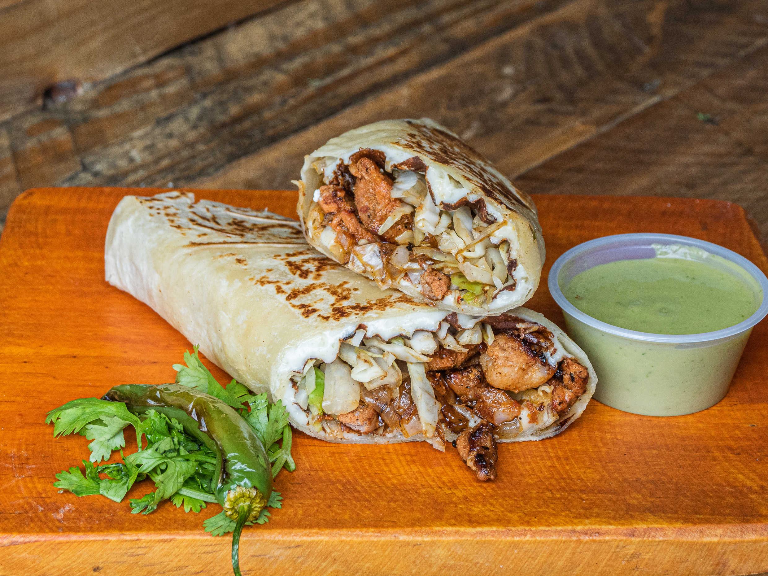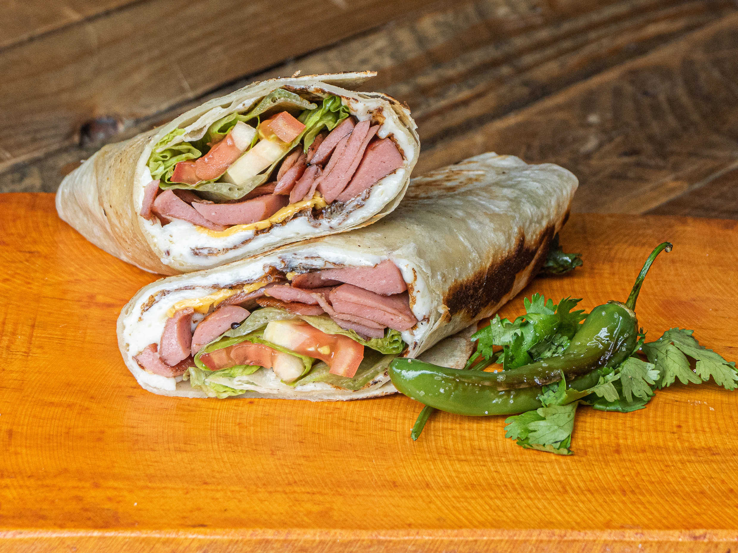 Tortilla de harina, queso oaxaca, queso americano, lechuga, jitomate y aderezo de la casa.