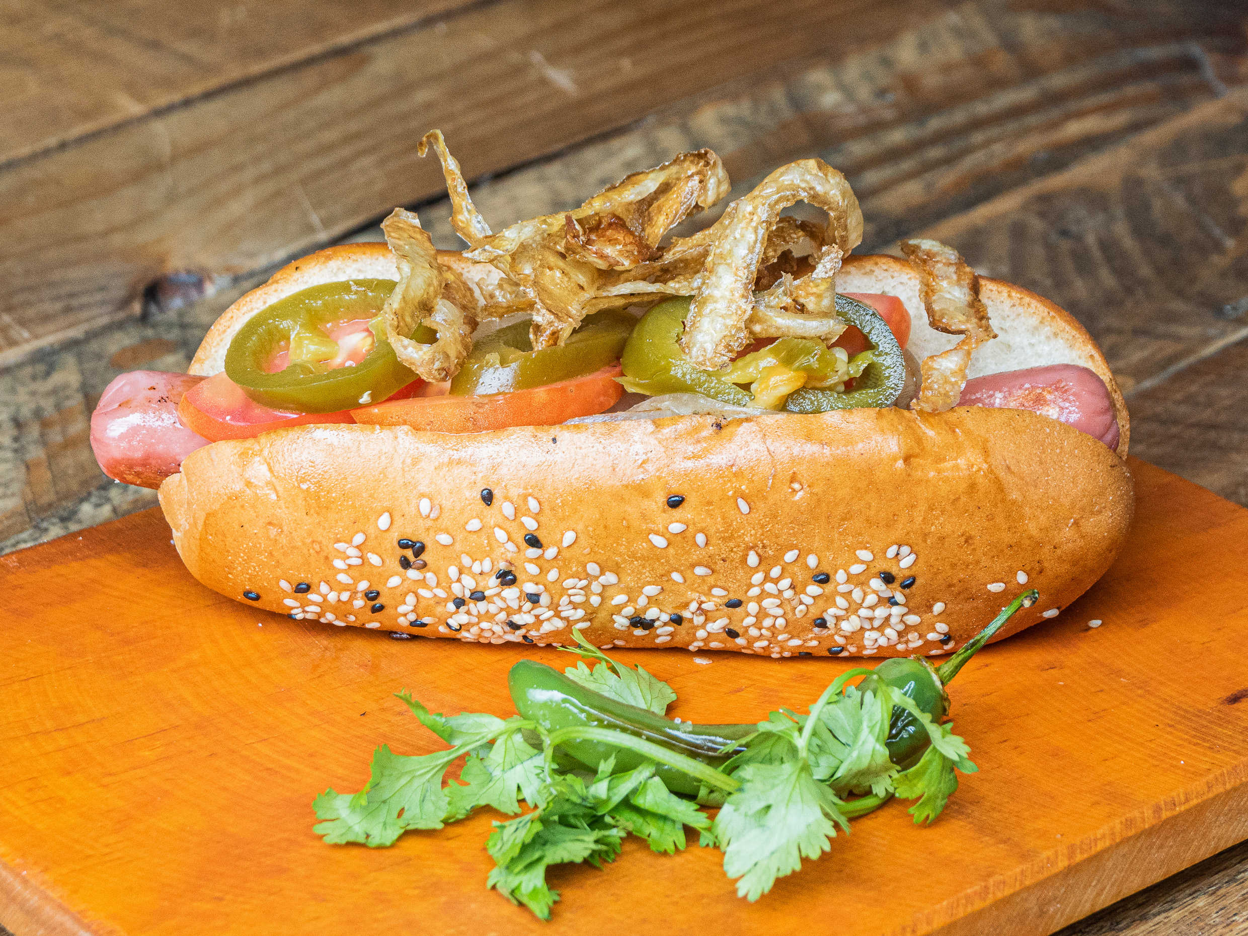 Pan de la casa, salchicha de Viena, cebolla asada, jitomate, aderezos de la casa, y chips de papa.