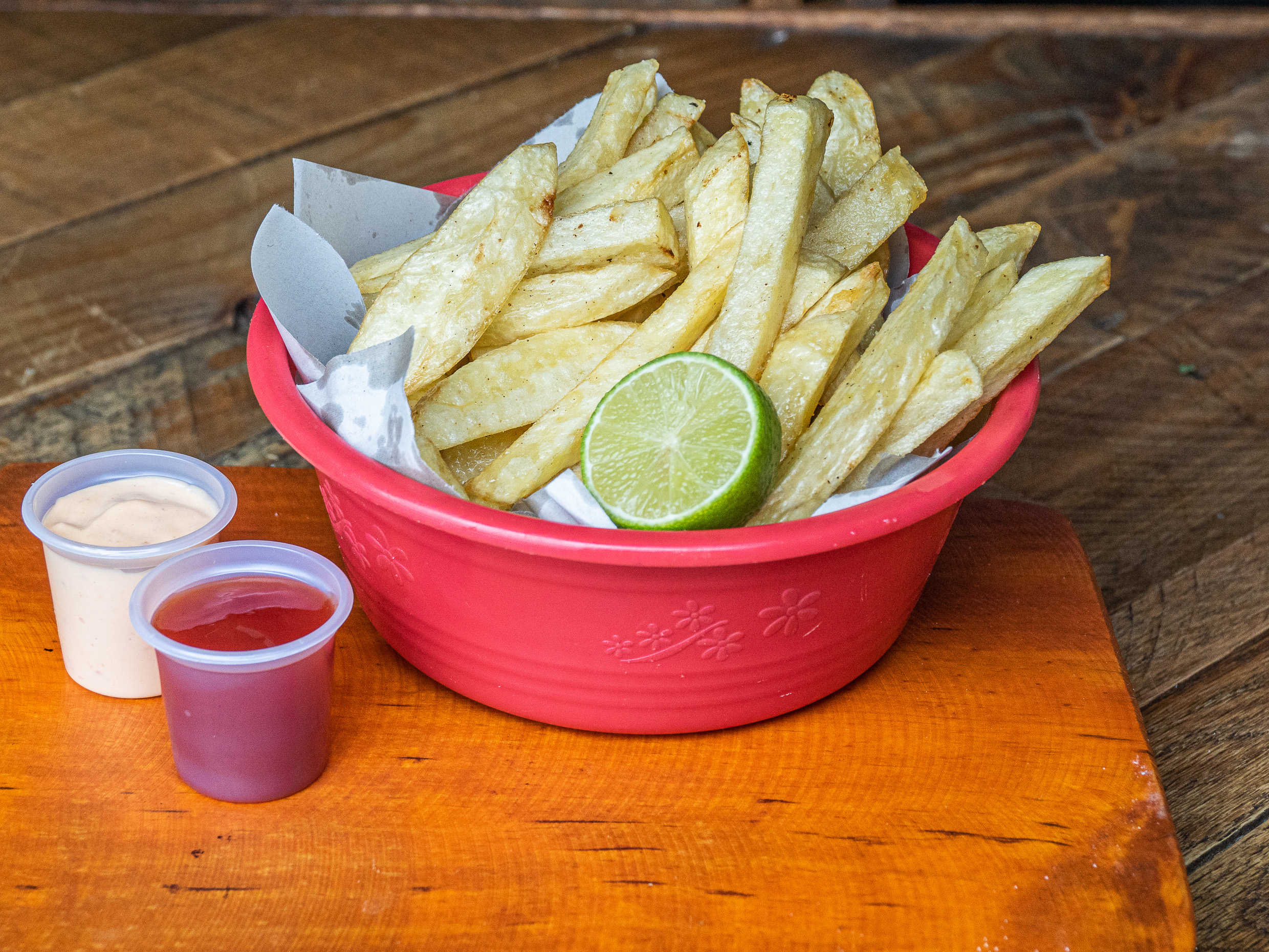 Acompañadas de cátsup y aderezo de la casa.