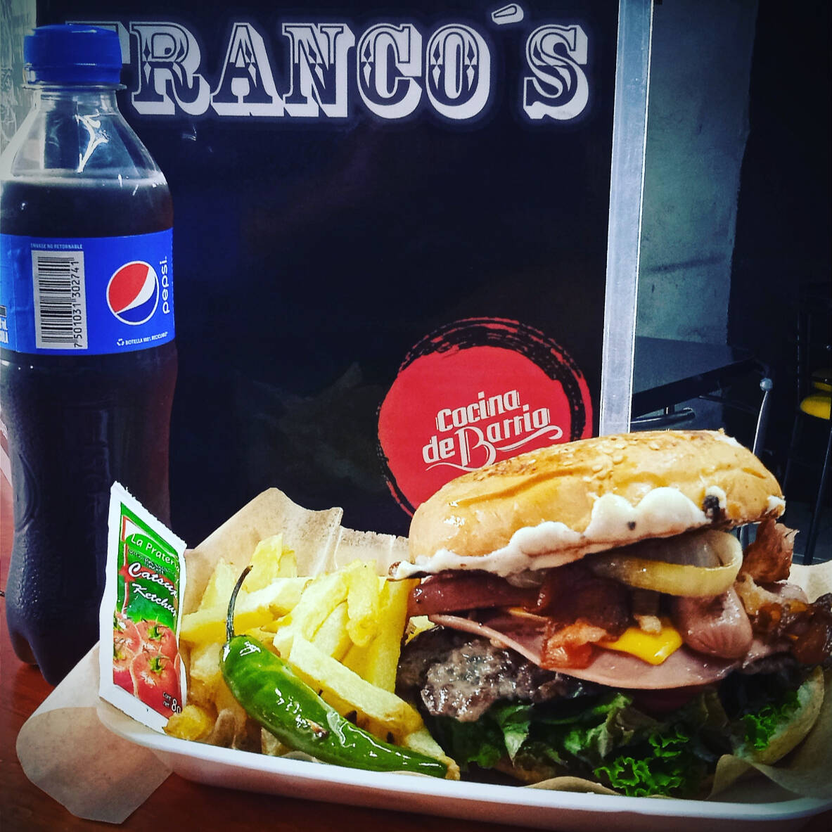 1 hamburguesa francos, 1 extra de papas francesas, 1 pepsi de 355 ml.