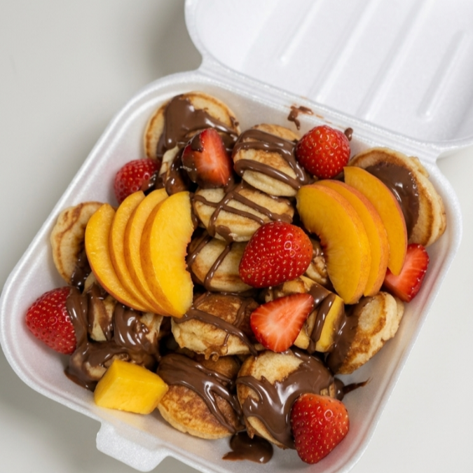 mini hot cakes con fresa, chocolate, Nutella y Durazno