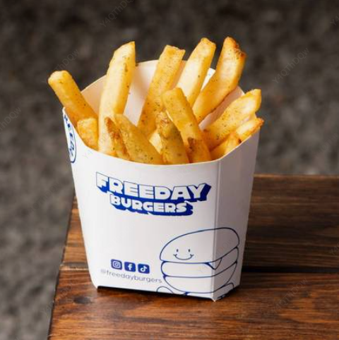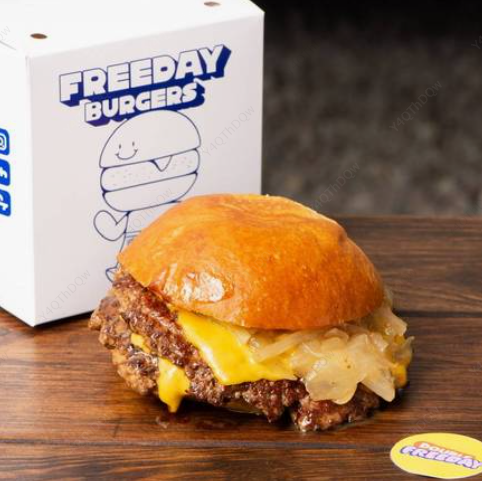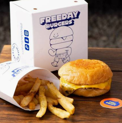 80 g De carne de res, queso americano y aderezo de la casa. Acompañada con 100 g de papas fritas.