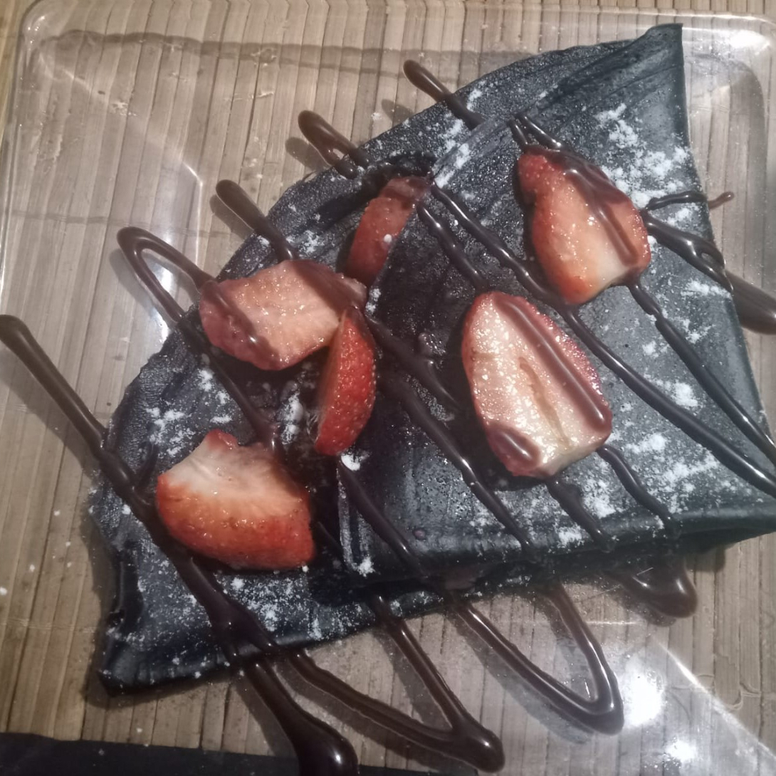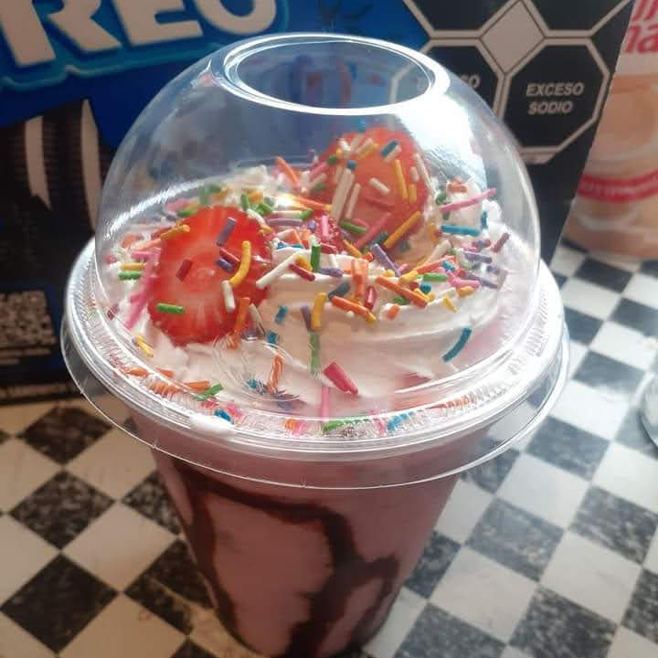 Leche entera, fresa natural, chocolate líquido Hershey, crema batida y chispas chocolate.