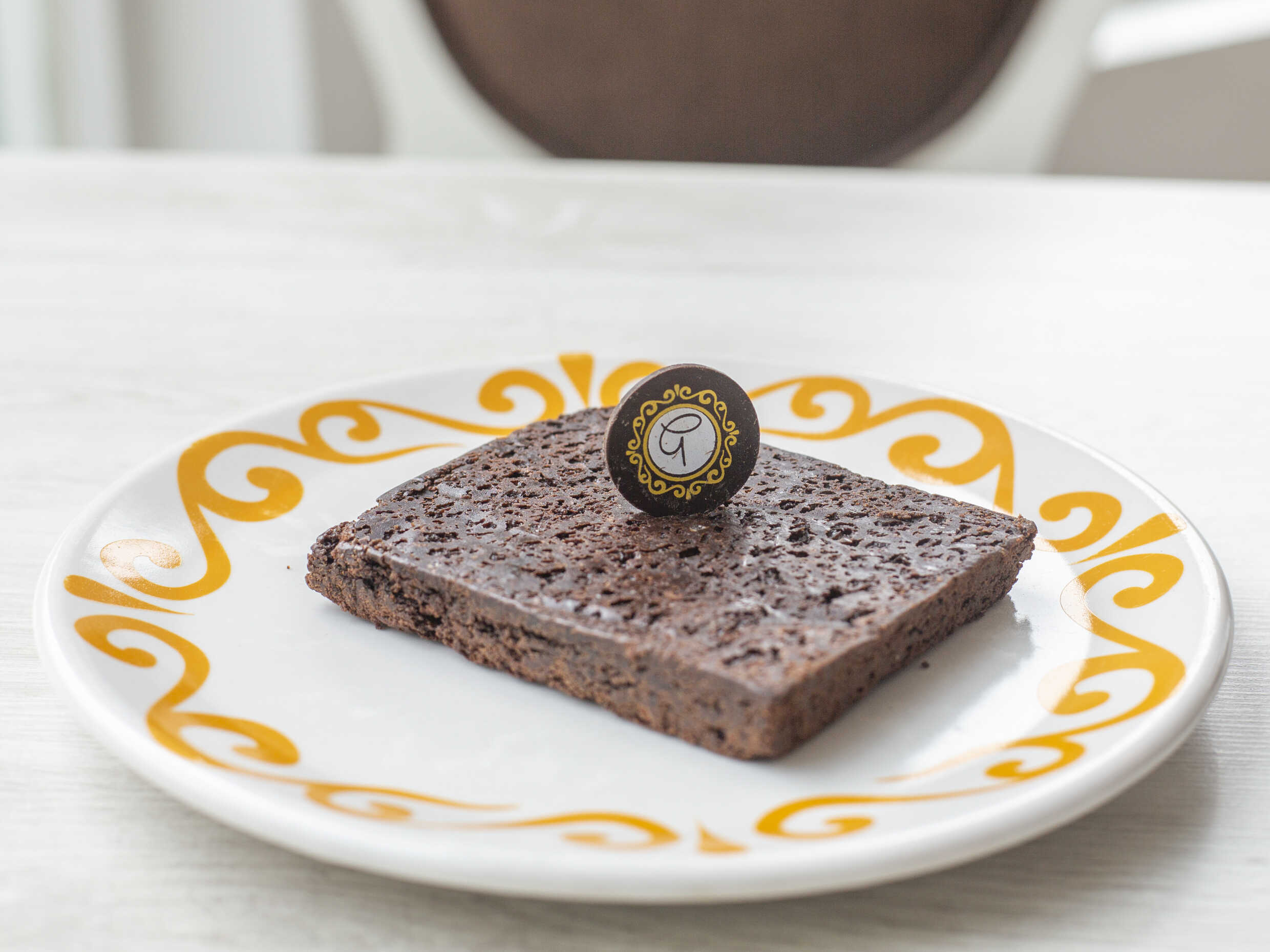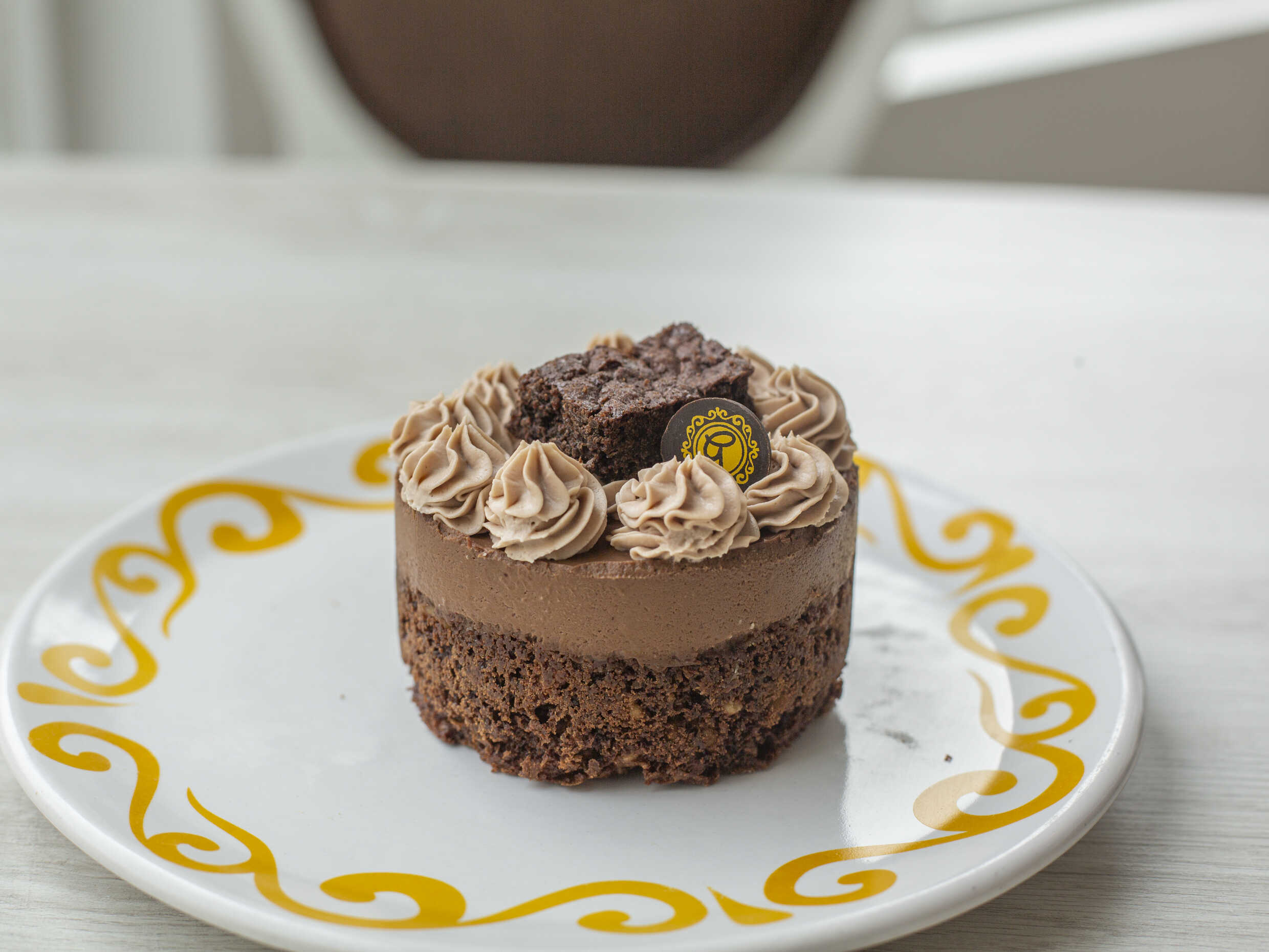 Bizcocho de brownie con nuez, cubierto de crema de chocolate y café, decorado con chantilly de chocolate con leche y brownie bites.